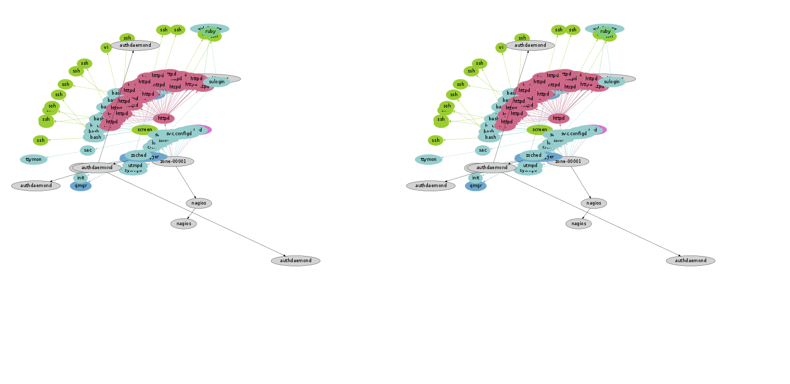 These images were created using some awk to convert the process and trace data into graphviz format, and then rendered. See the cloud page for some example code. The thermal images increased color saturation (red) and reduced transparency for the longer running processes. Each image had the color scale adjusted to make best use of the range, with between 1 and 4 seconds set to be the reddest color, based on the longest run time captured in the image. For the server image, processes beyond 10 seconds run time were not colored (at that point, it's not really a short-lived process).