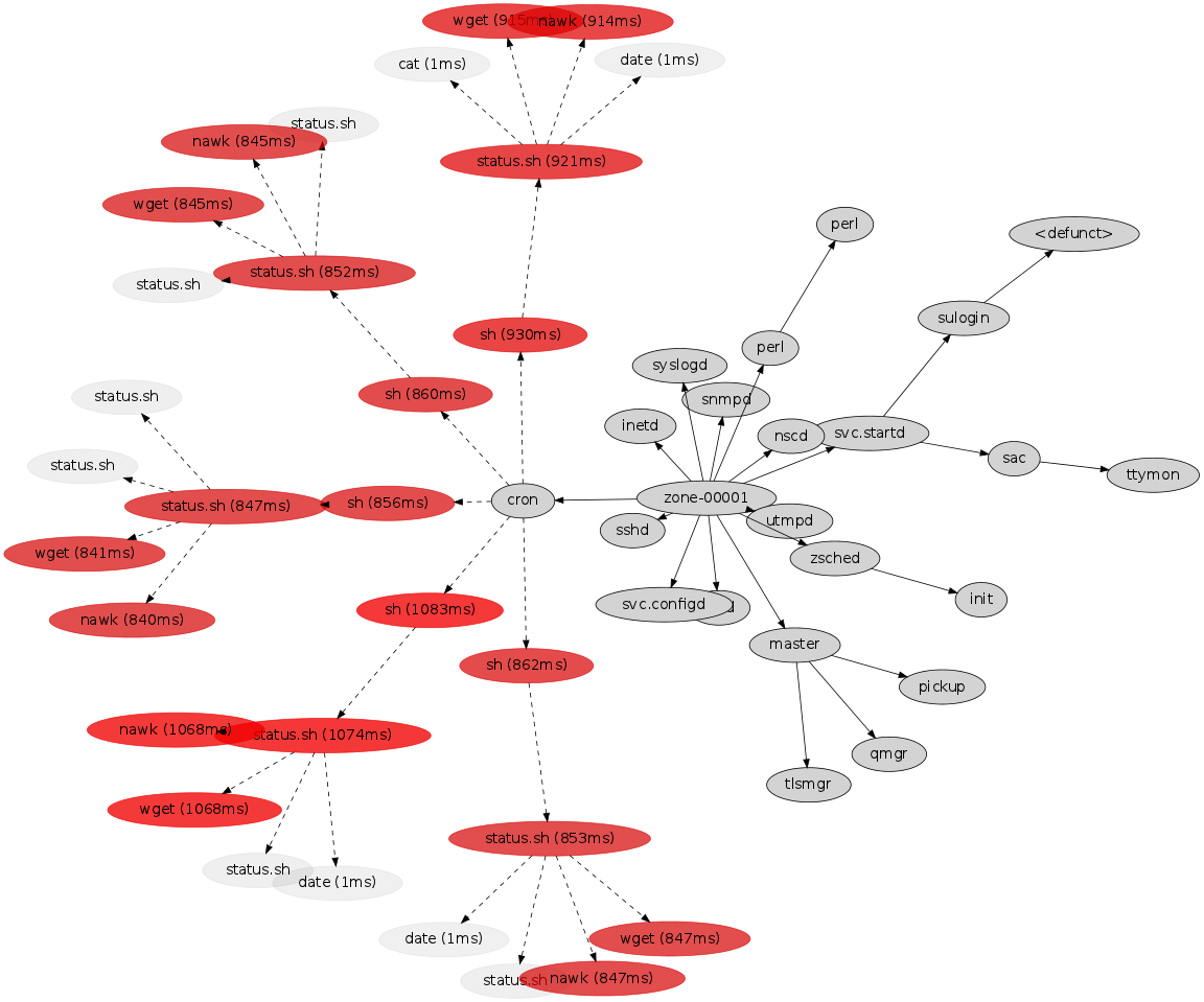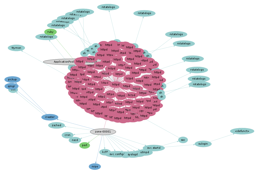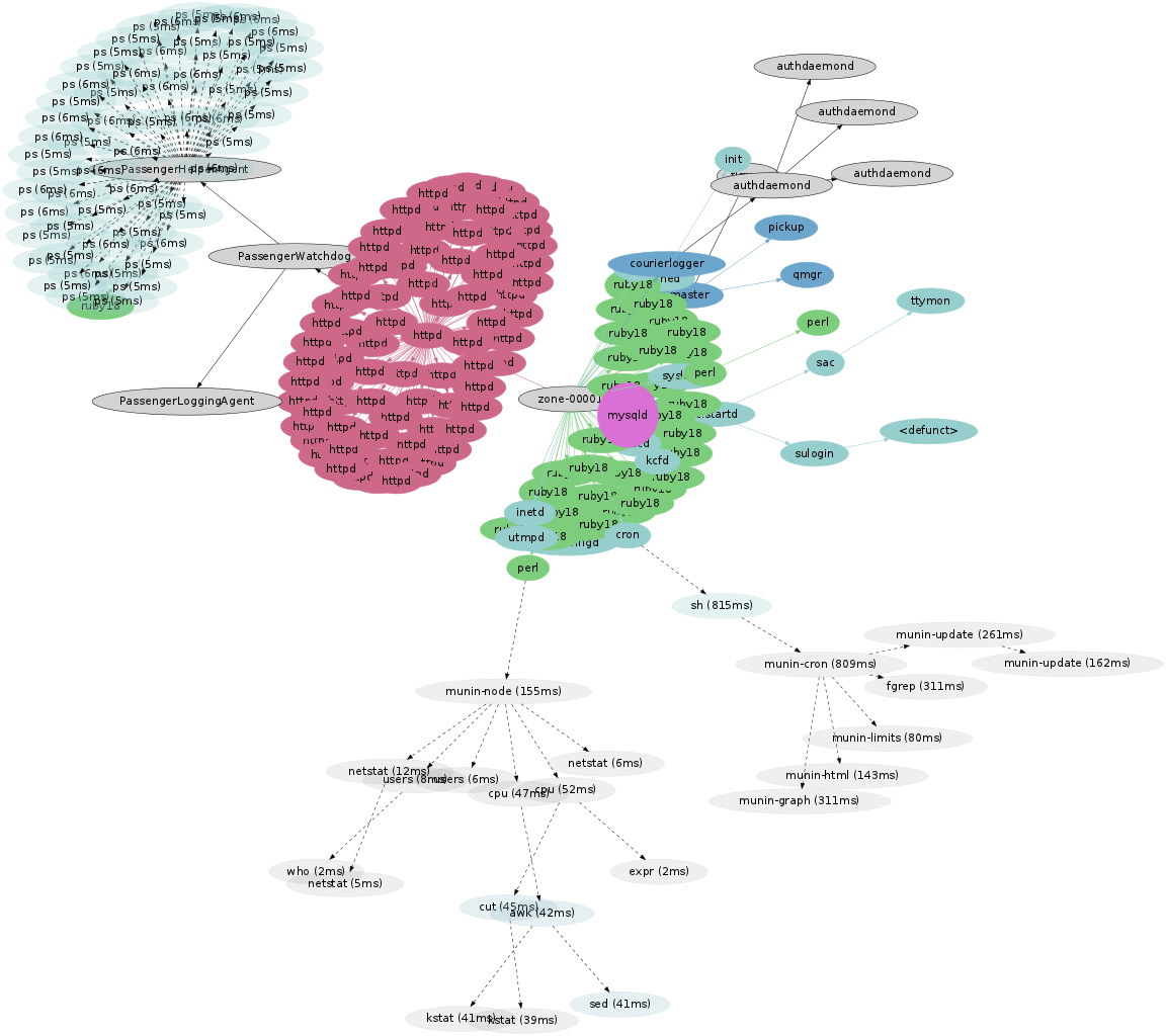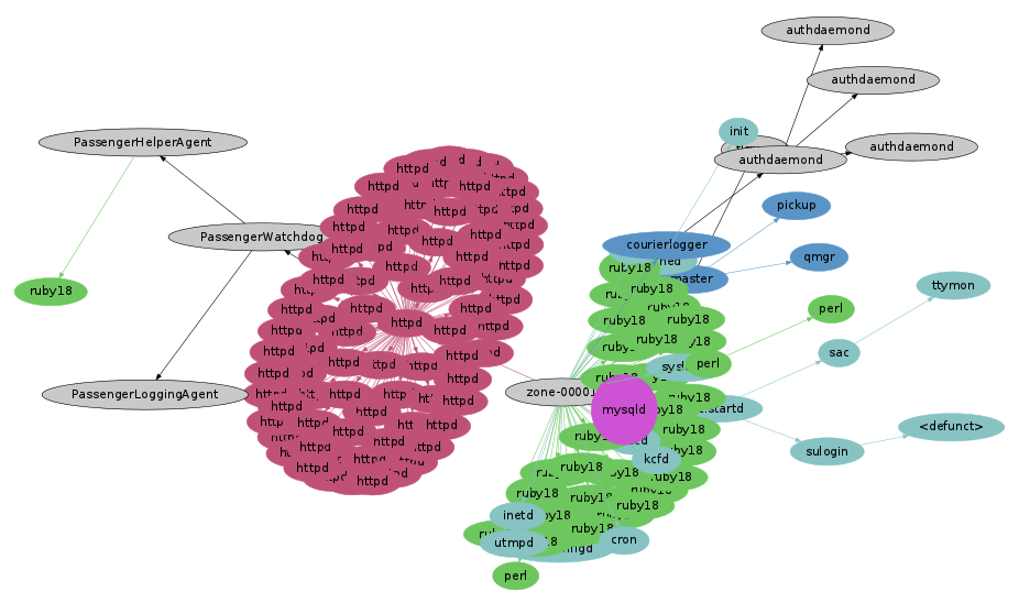 The actual data behind these visualizations is still straightforward: process status (ps) plus system-wide tracing (DTrace). Apart from the virtues of DTrace (and graphviz), the only other special technology at play here is OS virtualization, which facilitates capturing process snapshots and trace data across the cloud. The physical server image above was captured using one ps(1) and one dtrace(1M) command, which could see across all thirty active OS instances.