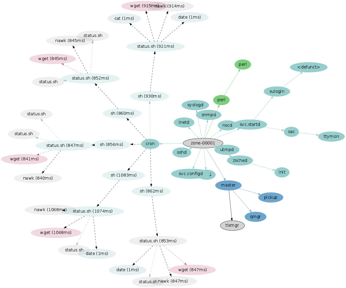 Tracing for long periods created a new problem that I have side stepped for now: the PID numbers can wrap. I hit this by accident a couple of times, which created bizarre connections across zones as graphviz created more than one PPID → PID arrow.