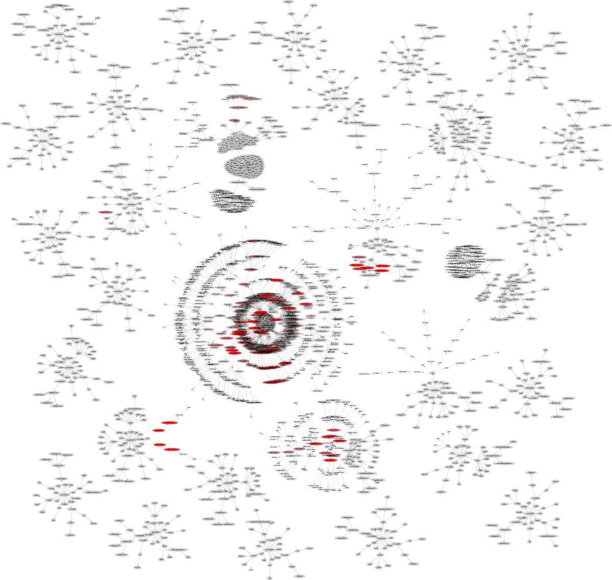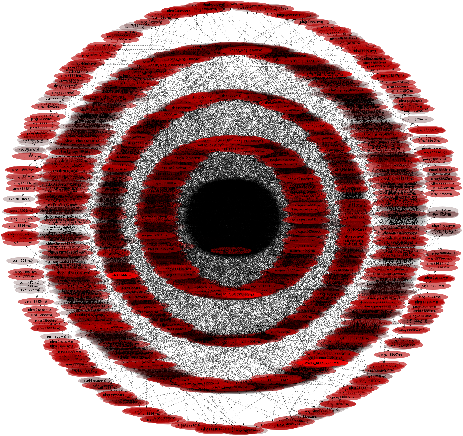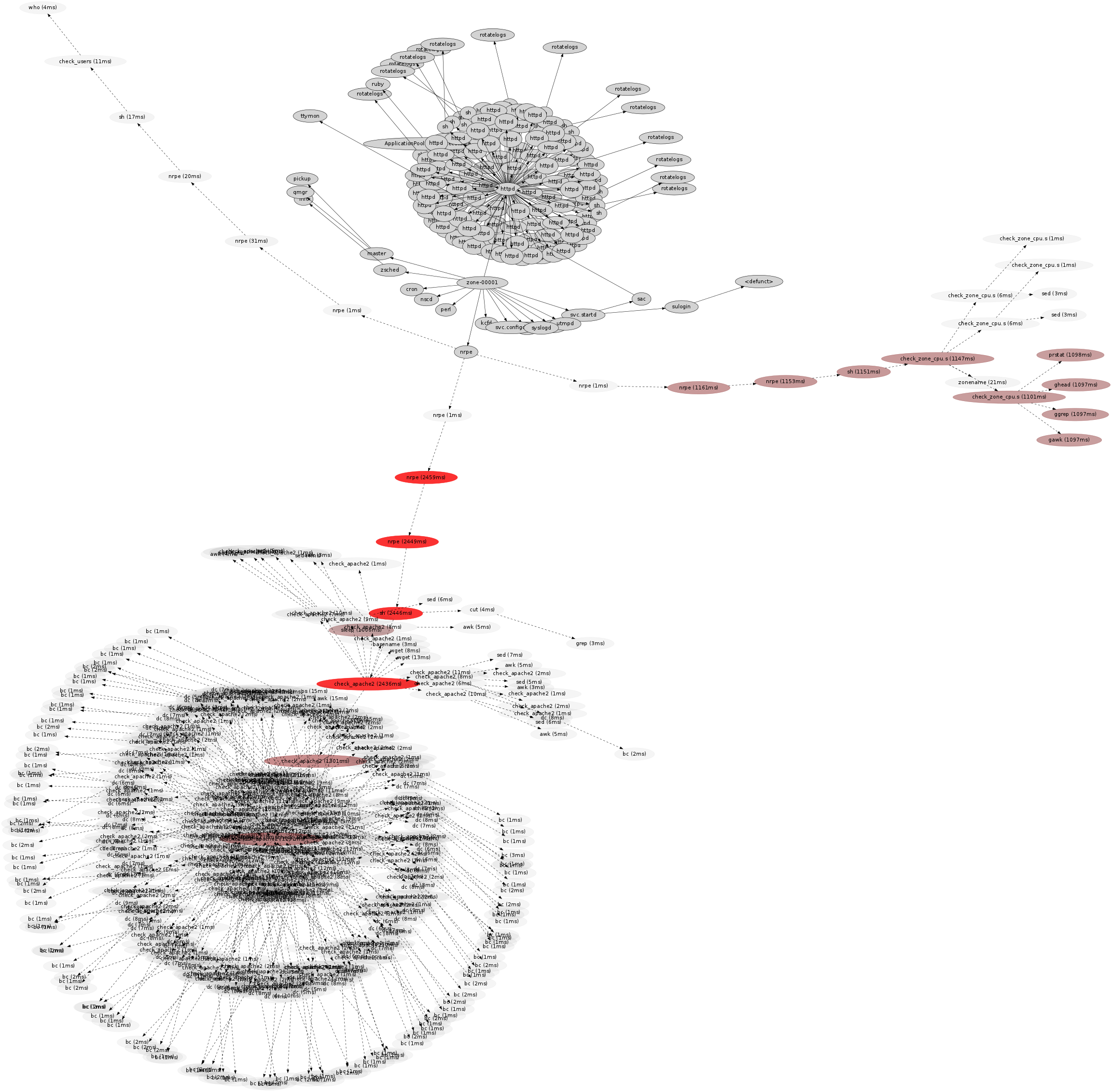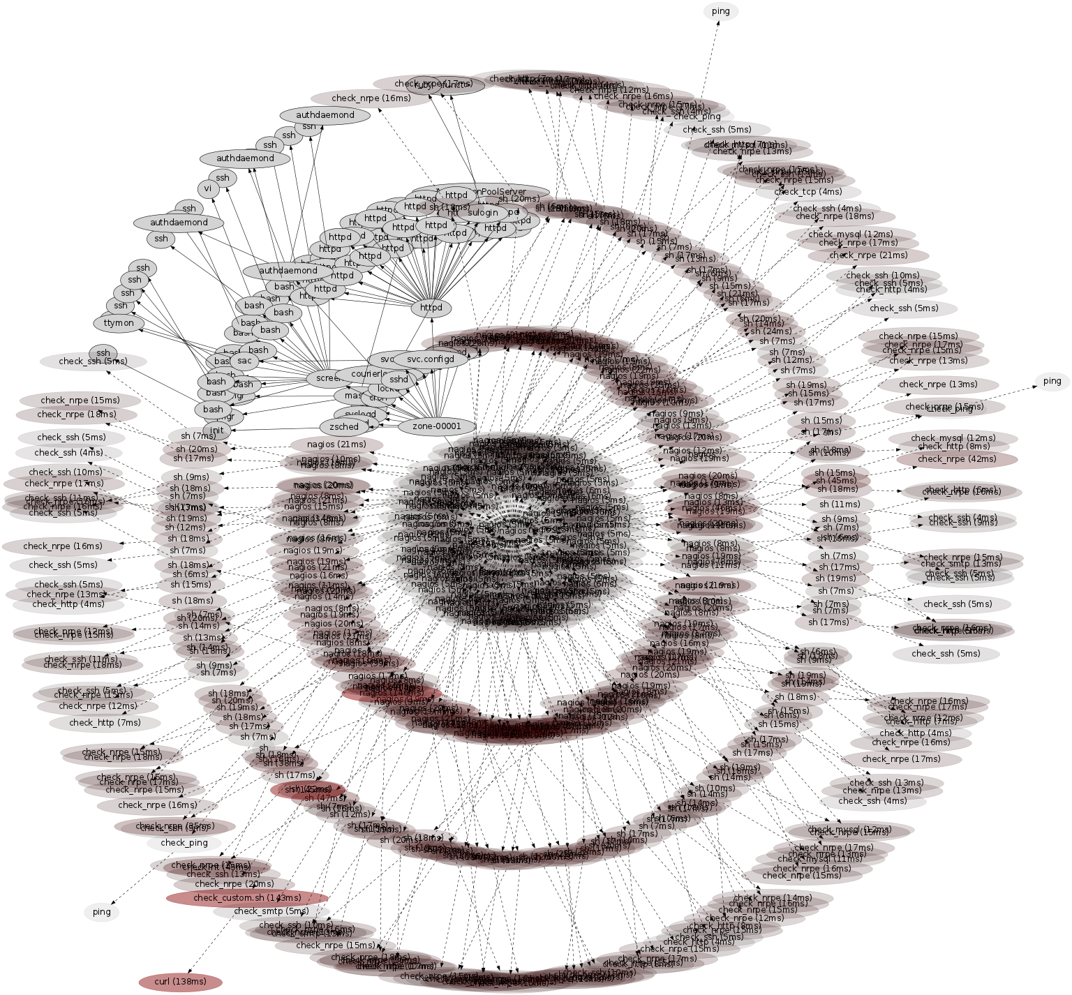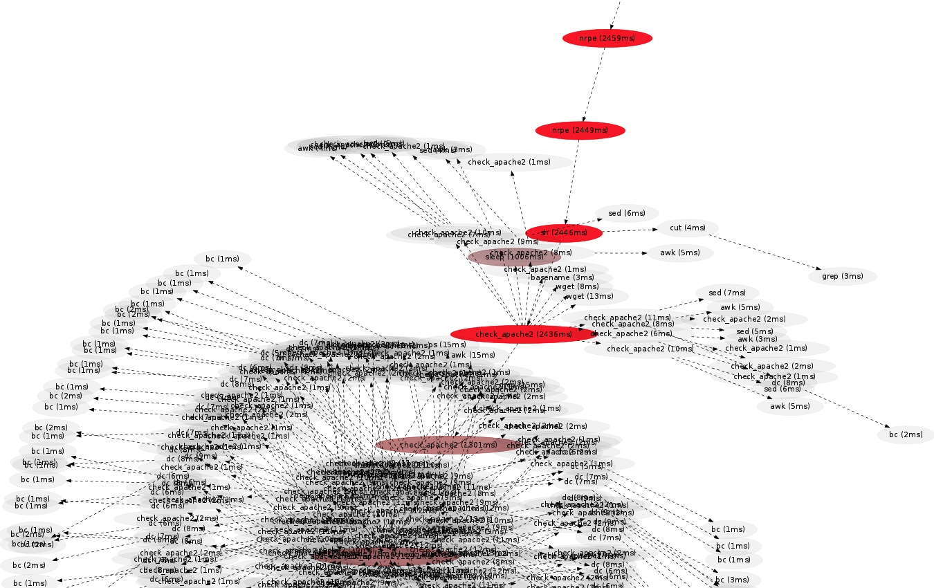 This cloud of processes was called from nrpe → sh → check_apache2. These are from the nagios monitoring software: nrpe is the nagios remote plugin executor, and check_apache2 is a plugin to check the health of the Apache web server. Zooming in: