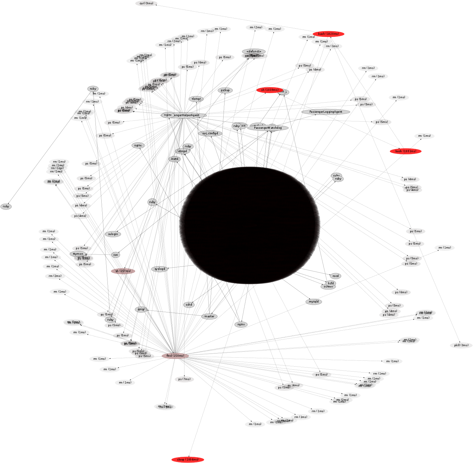While tracing the number of httpd and ruby18 processes were static. Short-lived processes where launched for munin (monitoring software) including munin-cron by the system scheduler (cron), and a number of "ps" processes were launched from PassengerHelperAgent.