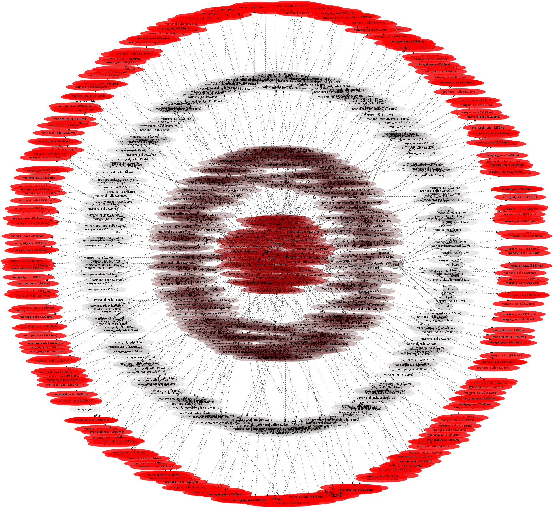 Ruby on RailsProcesses named mongrel_rails can be seen in this five minute image, with child processes running between 3 and 4 seconds.