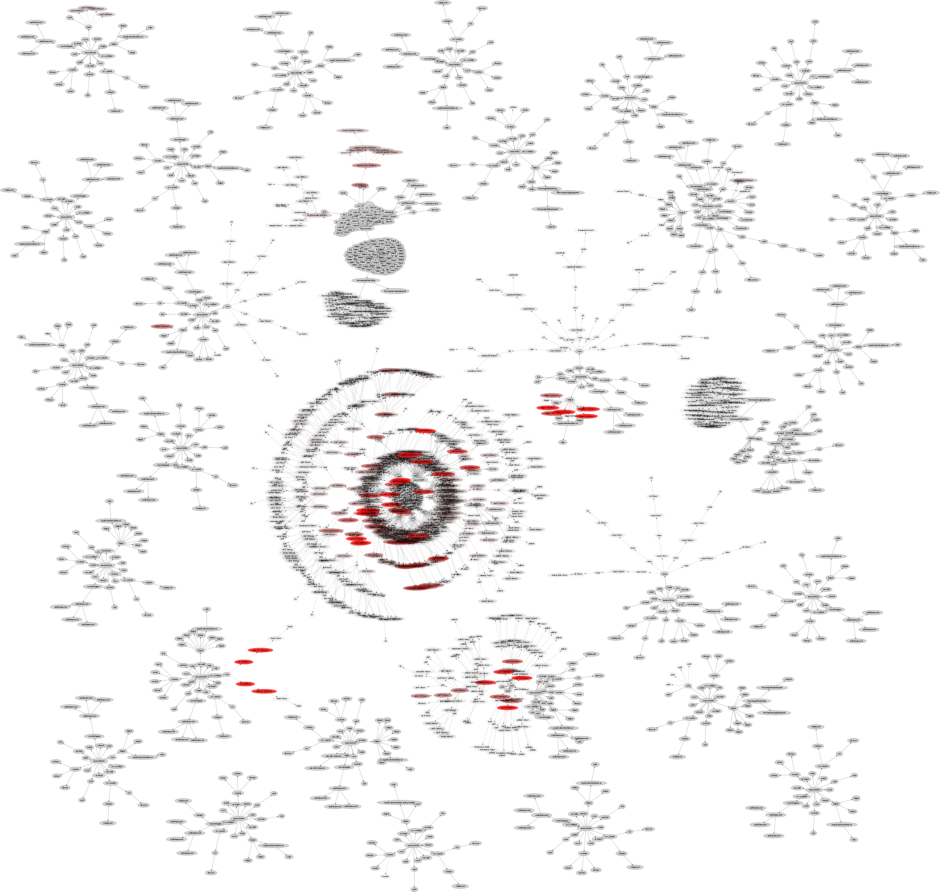 The previous images indicate process type using color hue. The following uses only the red hue and adjusts saturation based on the run time for the short-lived processes (redder == longer). The persistent server processes have been colored flat gray (non-transparent).