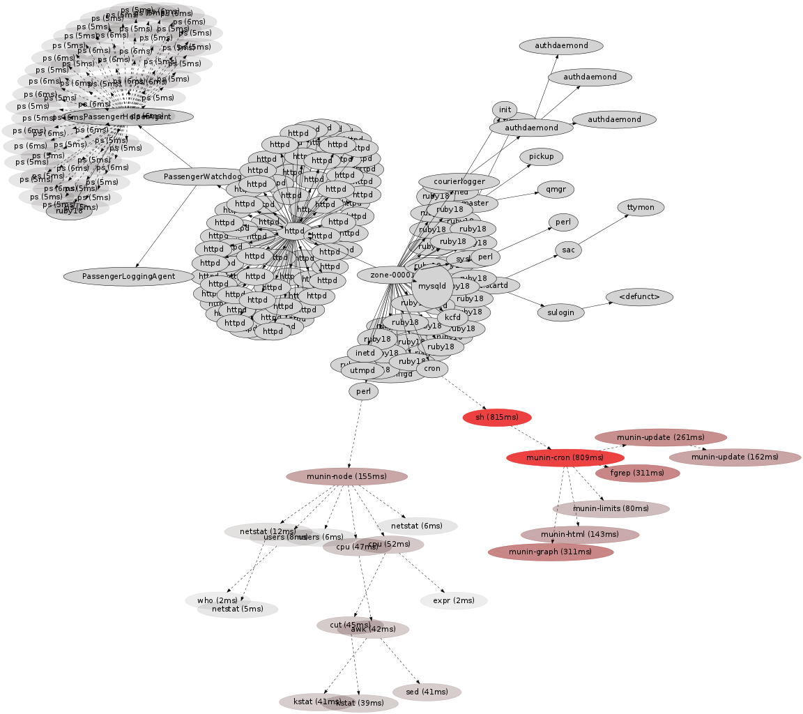 Now the longer runnning short-lived processes stand out along with their children, allowing the critical path of latency to be followed. The longest running was munin-cron, launched from a cron shell (sh) taking 815 ms. Two of its children, munin-graph and fgrep, both took 311 ms, which suggests they ran together via a Unix pipe. This highlights that run time - the time from a process birth to its exit - is inclusive of wait time, in this case, the piped fgrep was likely waiting on munin-graph. A different type of time could be measured and visualized - CPU time - to reflect only the time that processes spent running on a processor.