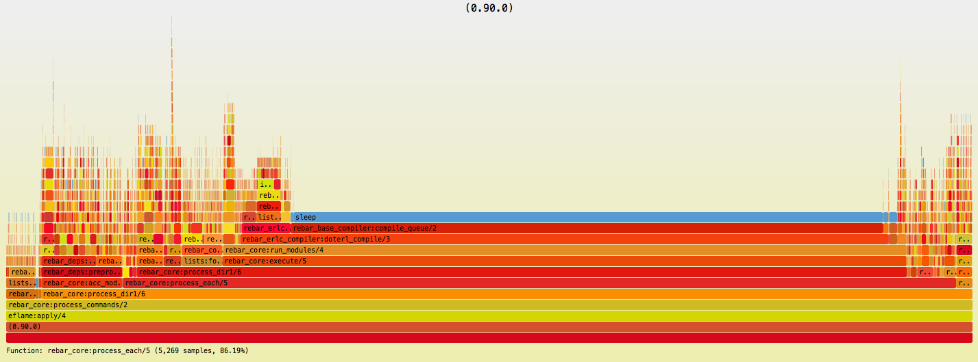 Vladimir Kirillov has included blocking calls in eflame, an Erlang Flame Graph profiler, by integrating the blocking data with the CPU profile, so that ancestry can be merged. The final blocking function is shown as blue on top of a warm stack. One of his examples: