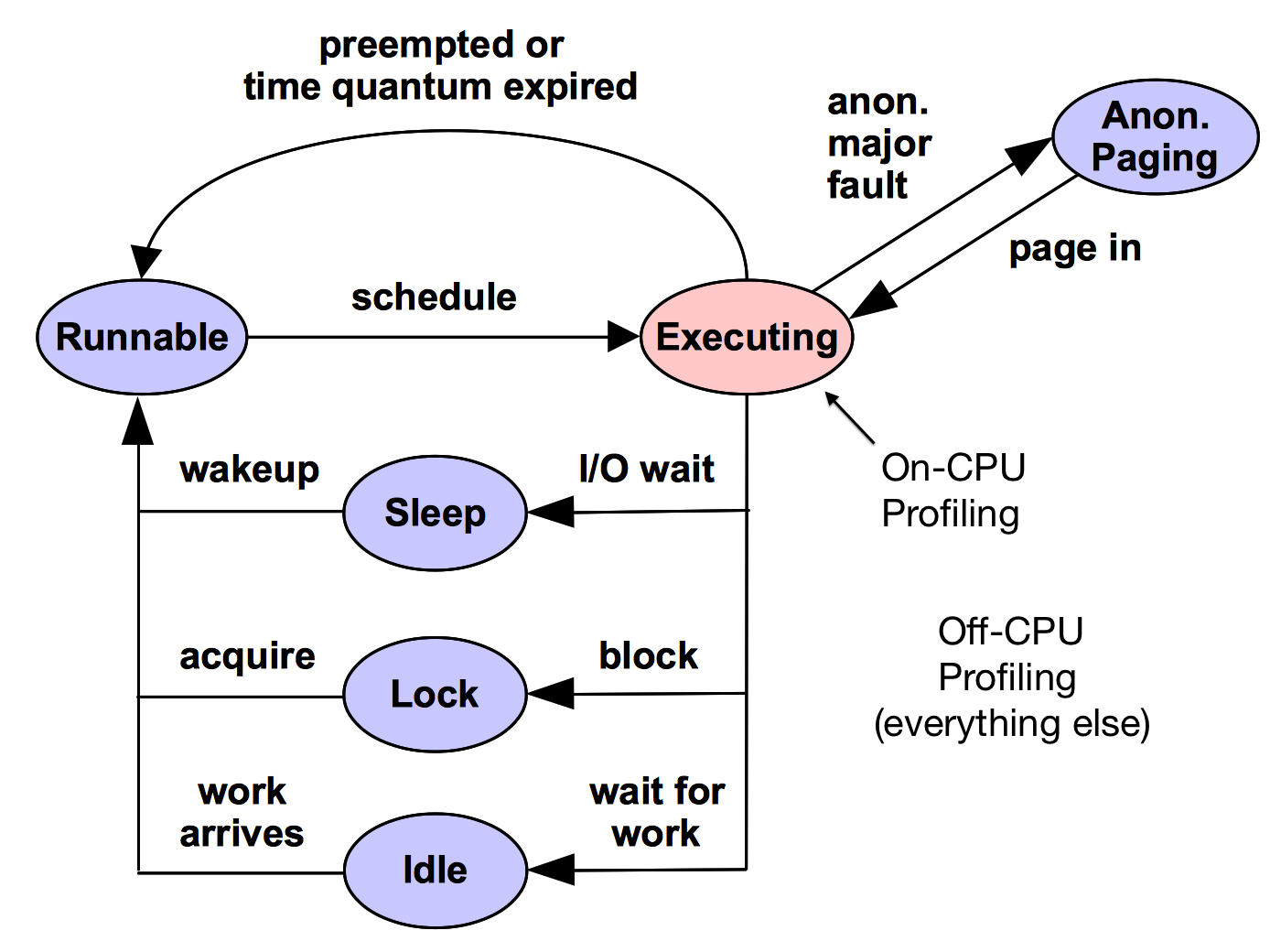 To illustrate the coverage, Figure 1 shows a generic thread state transition diagram, with the (hot) on-CPU state in red, and (cold) off-CPU states in blue: