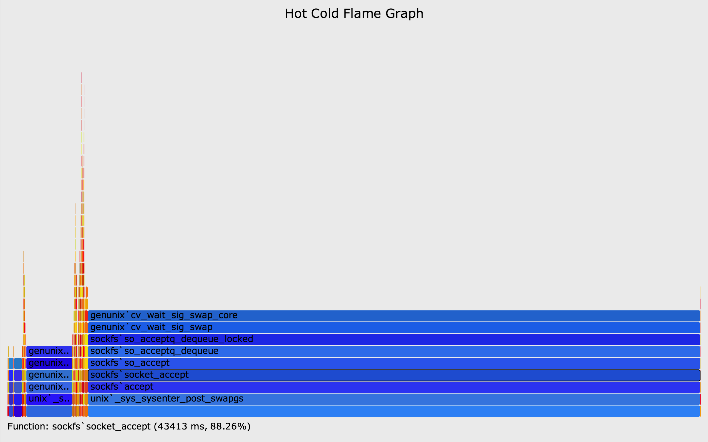 Having one flame graph show all of these states should be incredibly useful. However, so far these hot/cold flame graphs have proved difficult to use, and this remains experimental. I've created this page to share some work in this area.