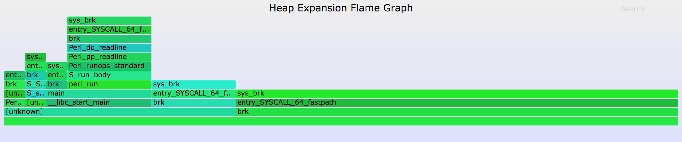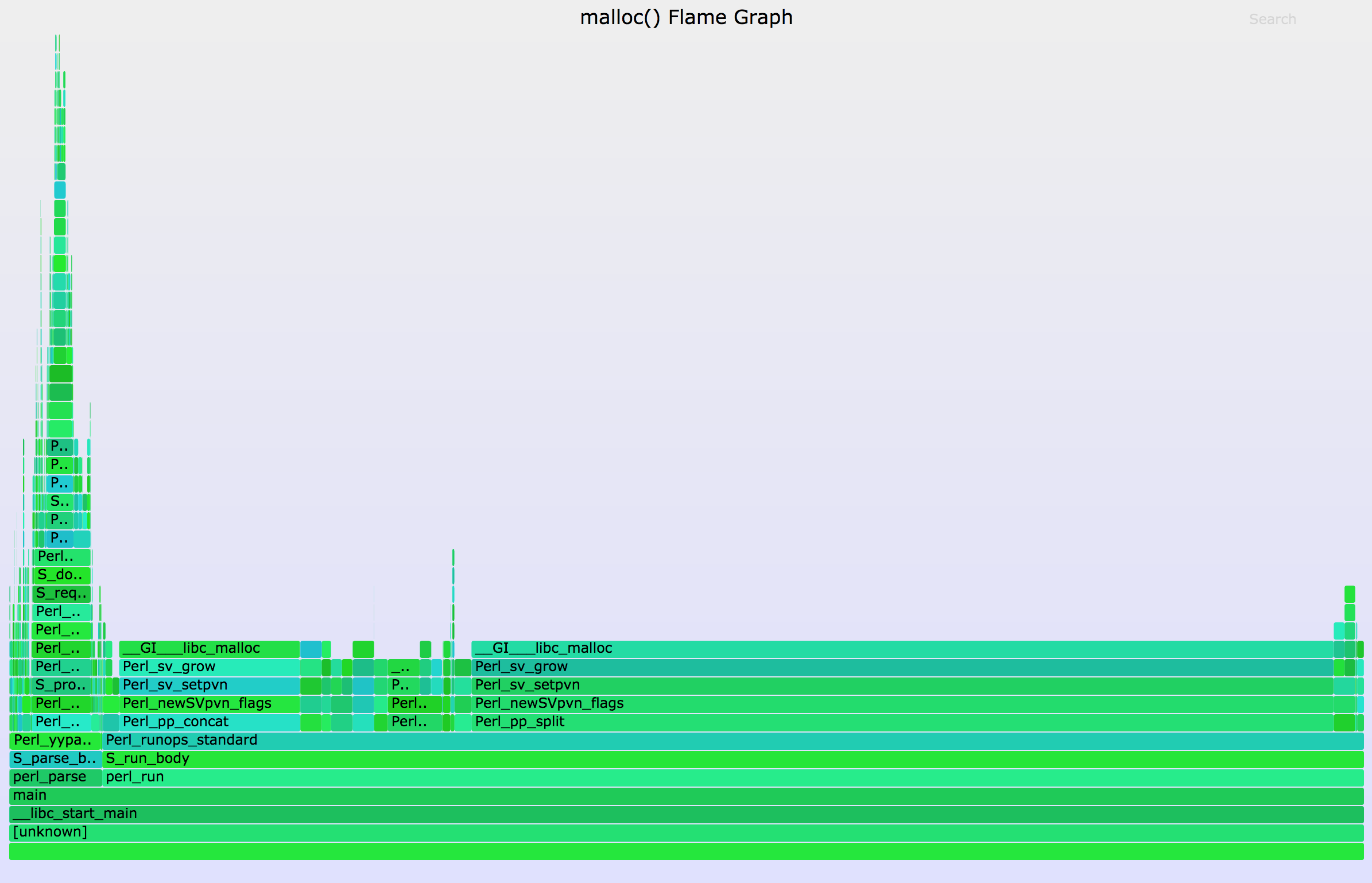 WARNING: The overhead of allocator tracing via Linux uprobes is high, as of Linux 4.15 (it might improve somewhat in later kernels). This Perl program ran 4x slower (from 0.53 seconds to 2.14 seconds). Yes, this is despite using in-kernel frequency counting of the stack traces. At least it is faster than libtcmalloc's heap profiling, which for the same program made it run 6x slower. This is something of a worst case, as it includes program initialization, which is malloc() heavy. MySQL server suffered a 33% loss in throughput while tracing malloc() (CPUs were at saturation, so there was no headroom for the tracer to consume). This is still likely unacceptable in production for anything beyond very short samples (seconds).