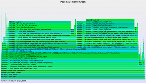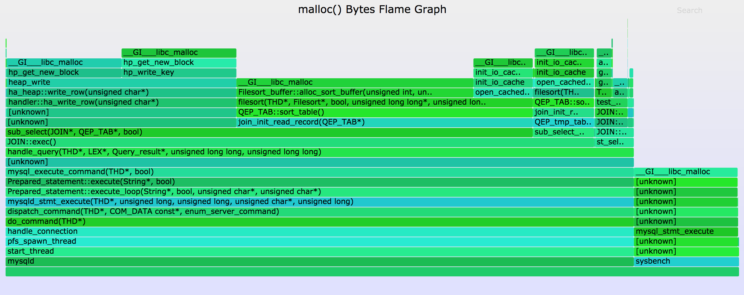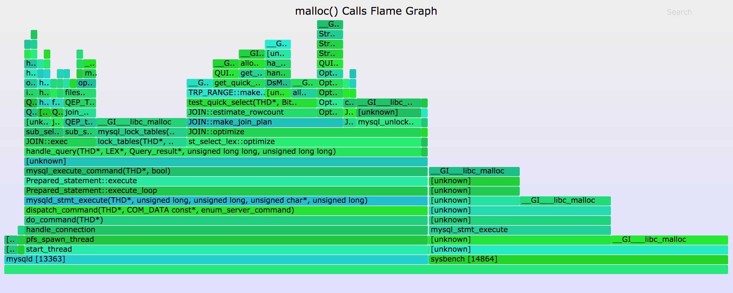 I'll take this example a bit further. It is a MySQL database server that is processing a benchmark load. I'll start with a malloc() count flame graph using stackcount as described earlier (but with stackcount -D 30, for a duration of 30 seconds). The resulting flame graph is (SVG, PNG):