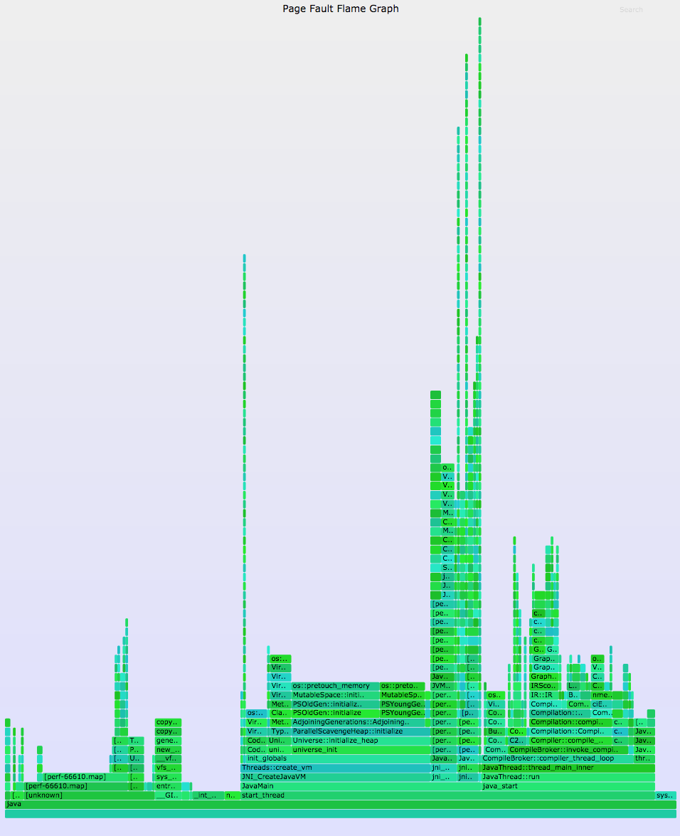 Again, some sleuthing is required to tell them apart. If you are hunting leaks and have a similar application that isn't growing, then taking page fault flame graphs from each and then looking for the extra code paths can be a quick way to identify the difference. If you are developing applications, then collecting baselines each day should let you identify not only that you have an extra growing or leaking code path, but the day that it appeared, helping you track down the change.