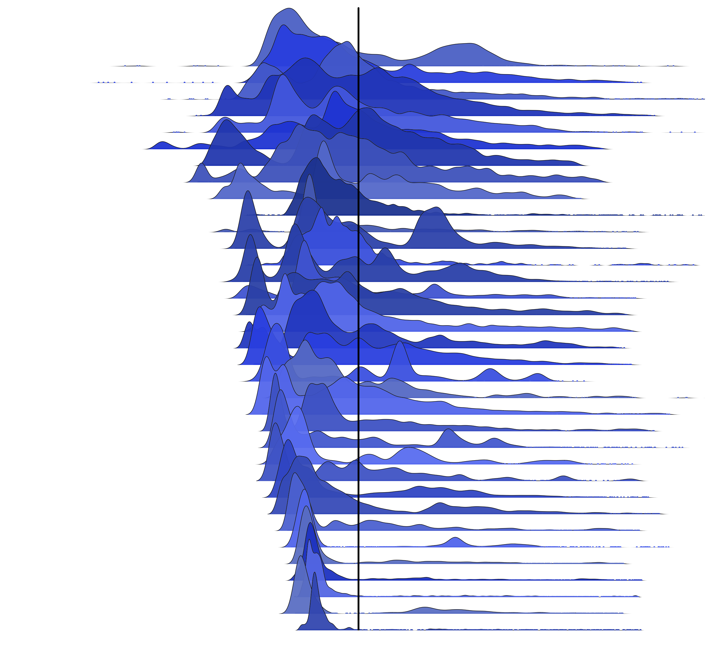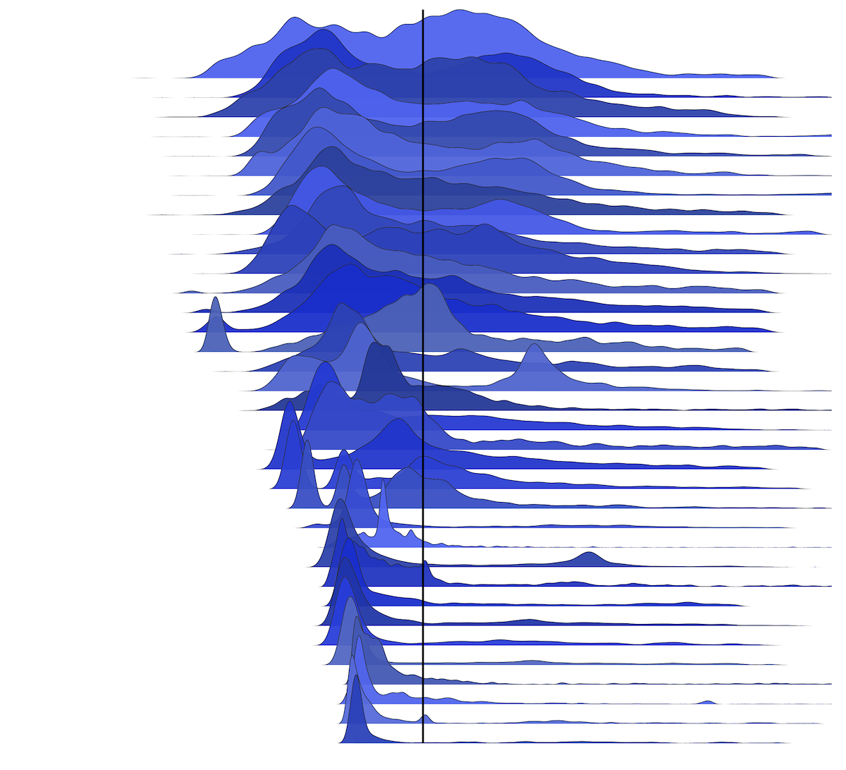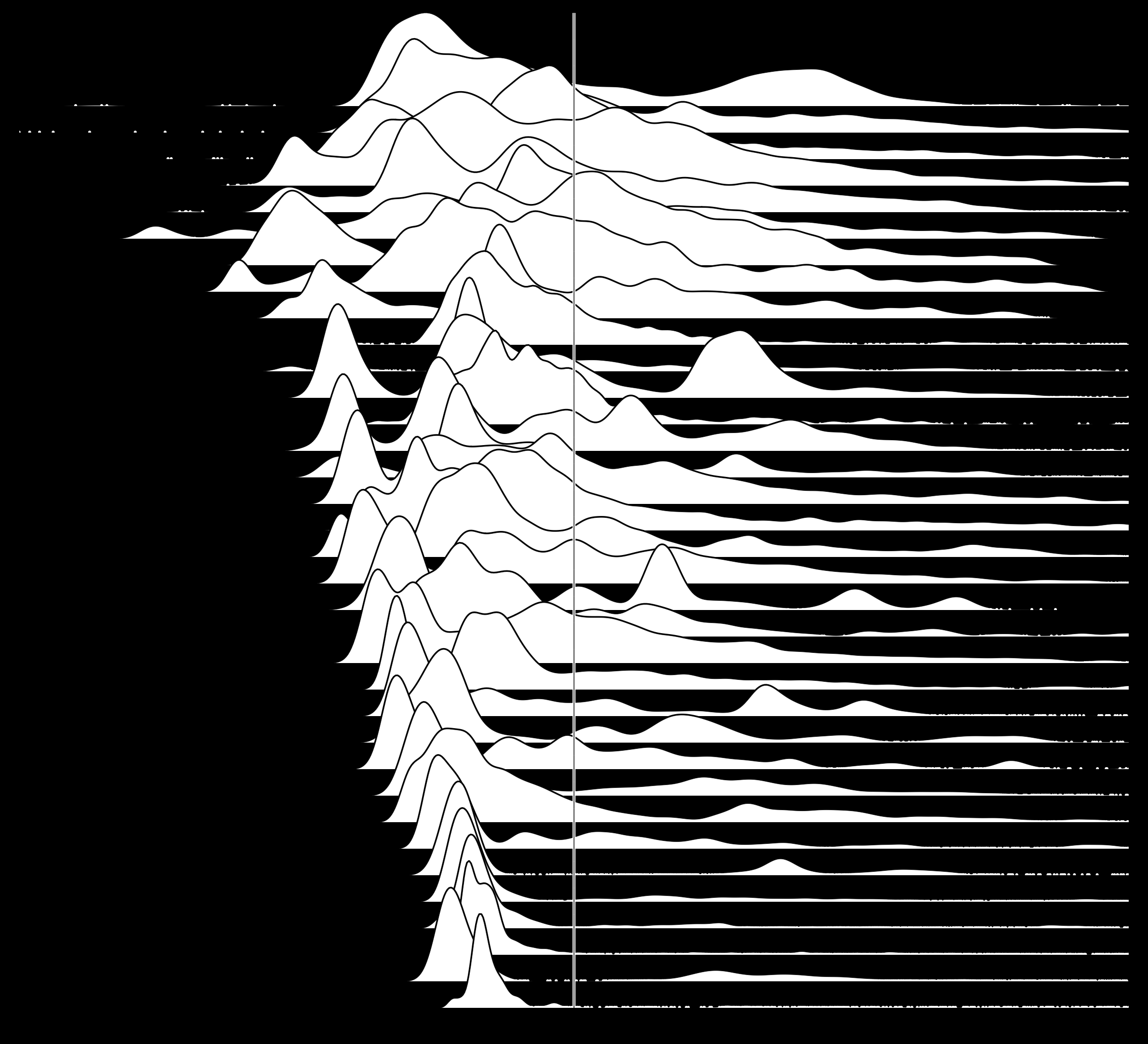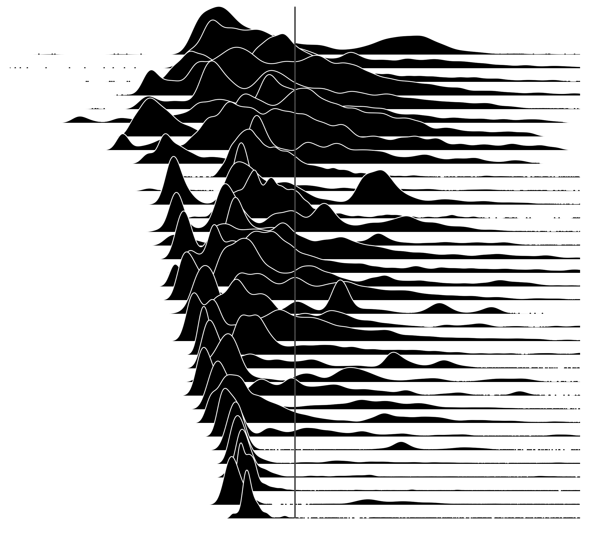 Now let's see the same 35 distributions, centered on the mean: