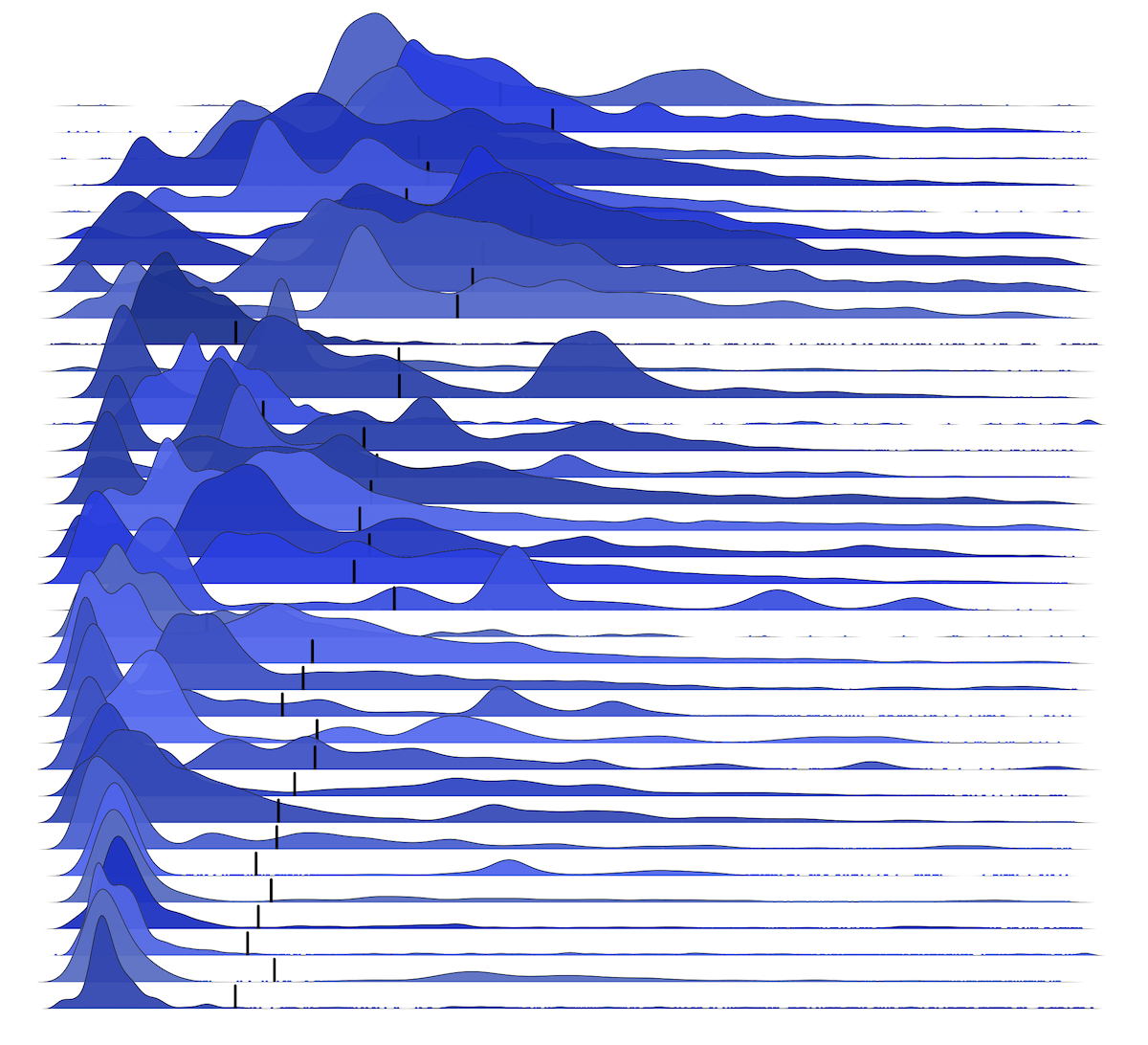 As another example, here are 35 distributions of disk I/O latency centered on the mean: