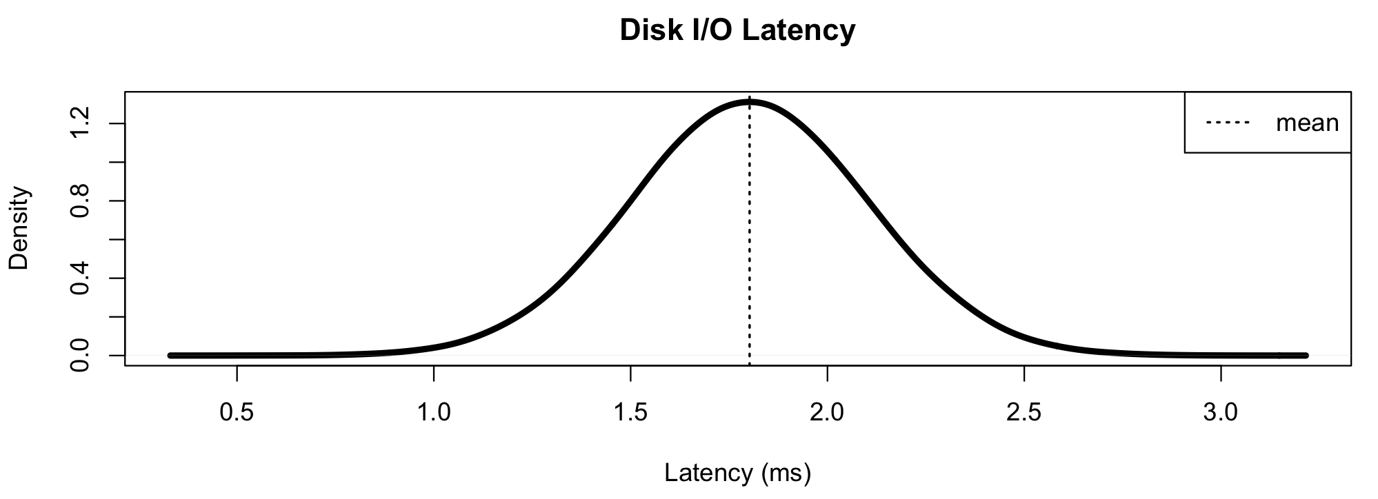 This shows a normal distribution centered on 1.8 ms. Maybe you guess a gamma distribution instead, or log-normal. Maybe you also have standard deviation, min and max, and 99th percentiles, and can guess more about the range of the distribution.