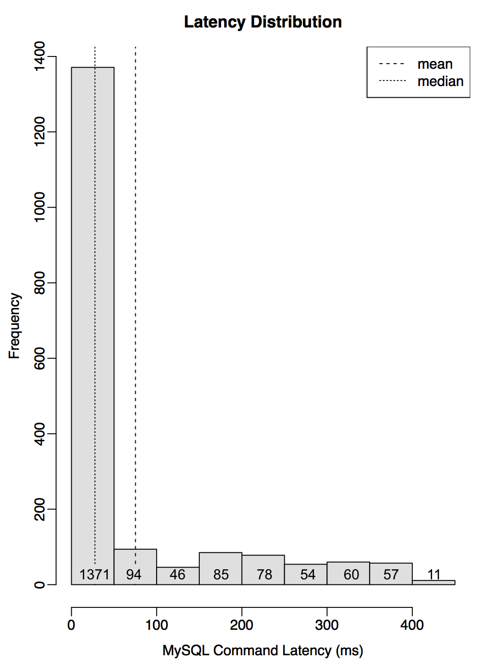 I've rendered the bottom distribution in the previous waterfall plot as a tall histogram with wide columns to magnify detail on the right of the mean, along with column counts to help us understand why the mean appears so offset. There are 1,371 MySQL commands to the left of the mean column, and a total of 391 to the right. For this to balance, the right hand counts would need an average distance of 3.5 columns (1371 / 391), which appears to be the case.