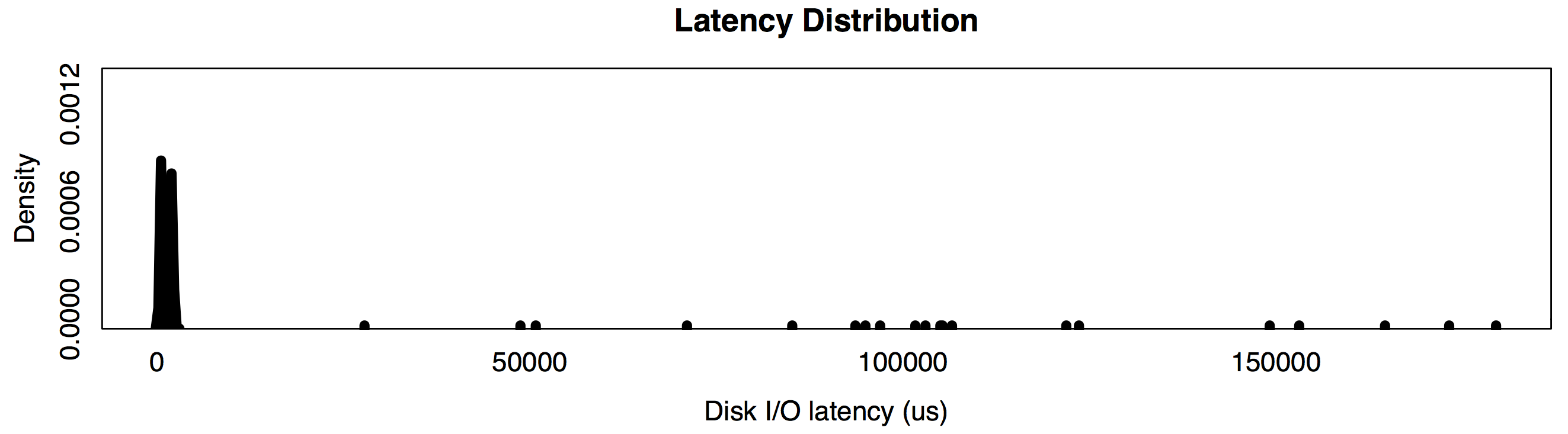 This can be reflected by weighting each I/O with its latency (something I learned from Bryan, who developed it as a colorization method for latency heat maps). This multiplies the distribution plot by the x-axis value. This example distribution would then have a latency cost mvalue of 4, as each mode has the same height (10 ms).