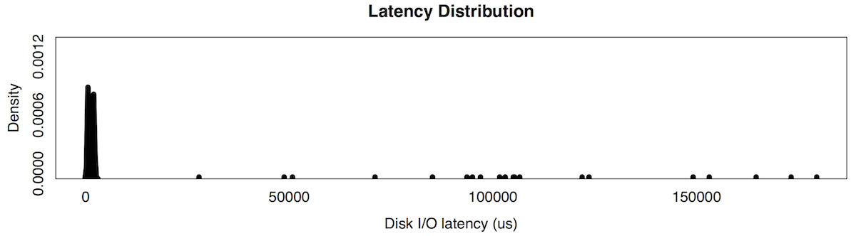 If you look back at the earlier disk I/O waterfall plot, there are many distributions with a very low major mode (disk cache hits), and a smaller and wider minor mode (disk cache misses). Accounting for latency cost, these minor modes will be magnified, and may cost more than the major mode.