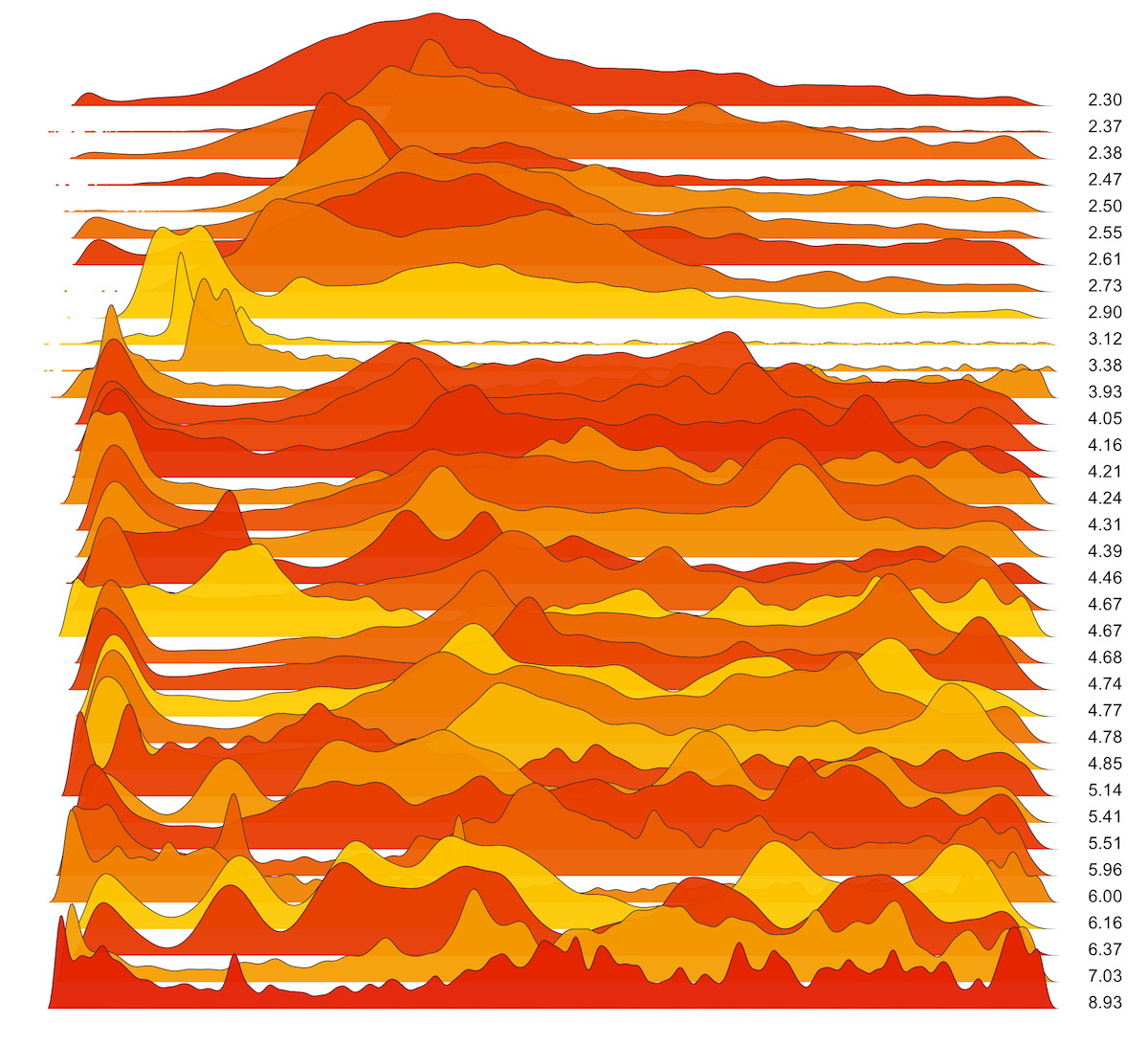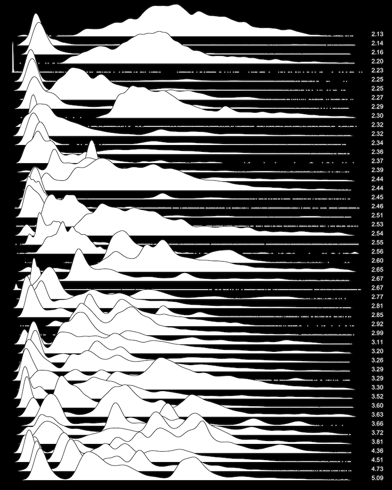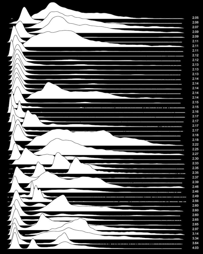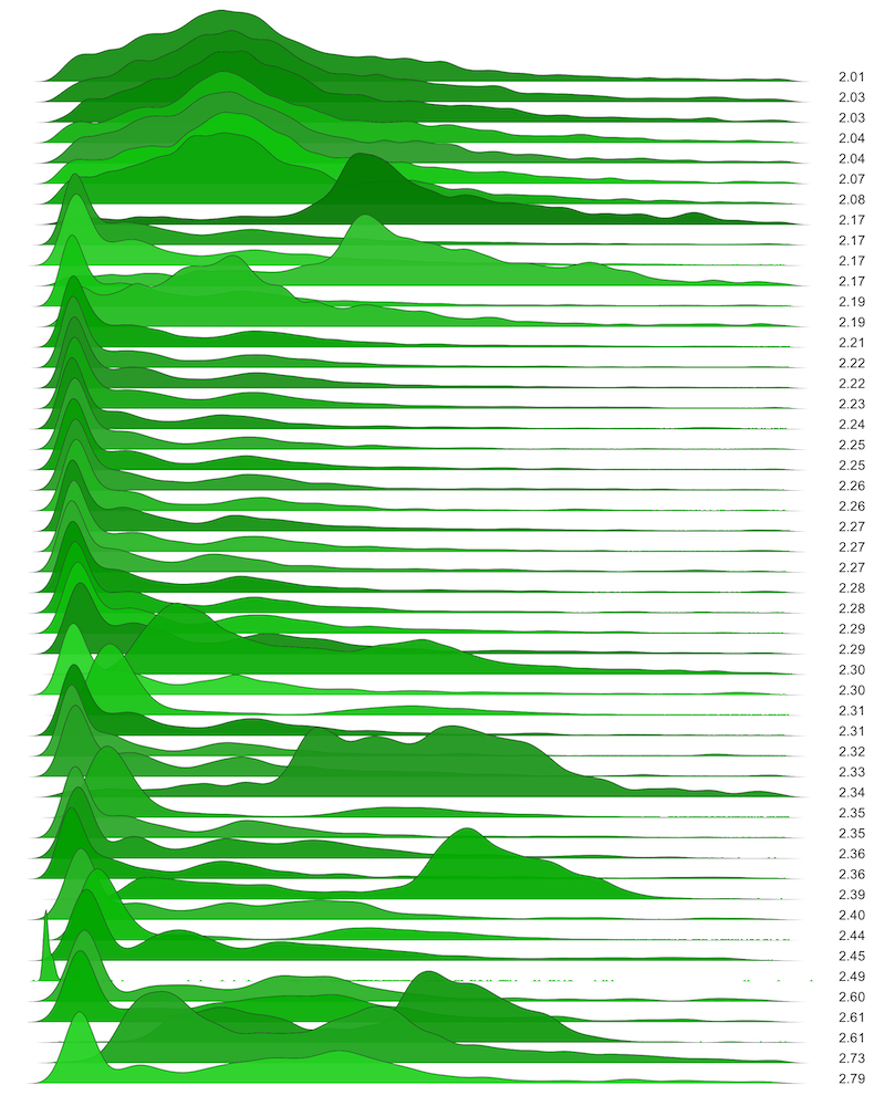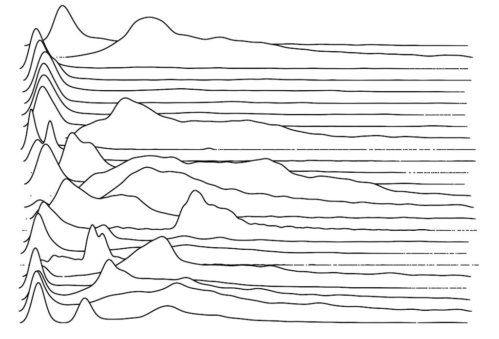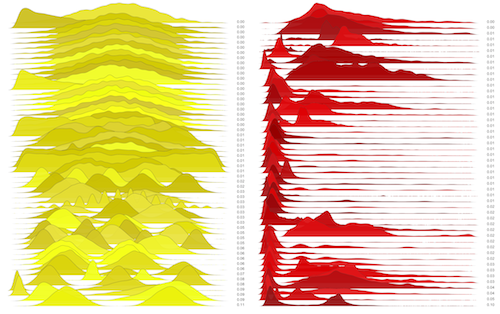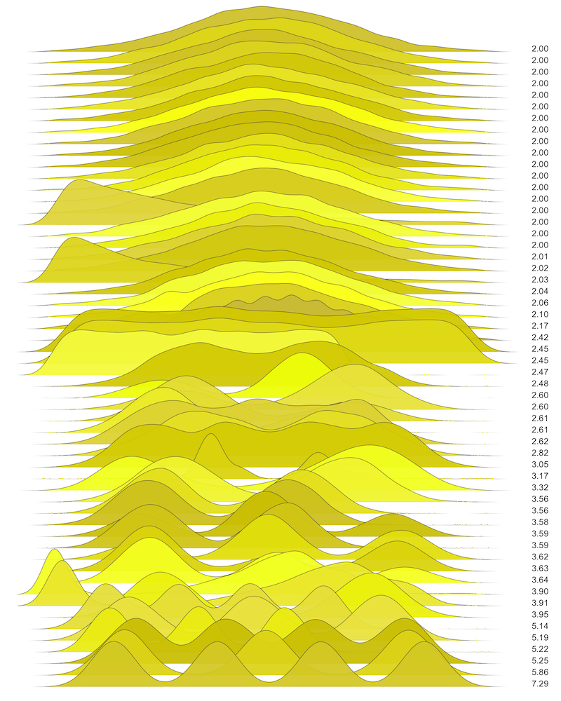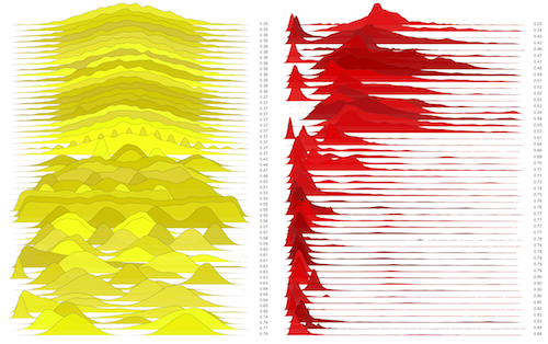These are waterfall plots of overlapping frequency trails, with the mvalue on the right. Each is a synthetic distribution from a collection I'm using to test modality detection. Since these often overlap, I've randomly colored them for differentiation, and also added a little transparency here so that background detail can still be seen if you look carefully.