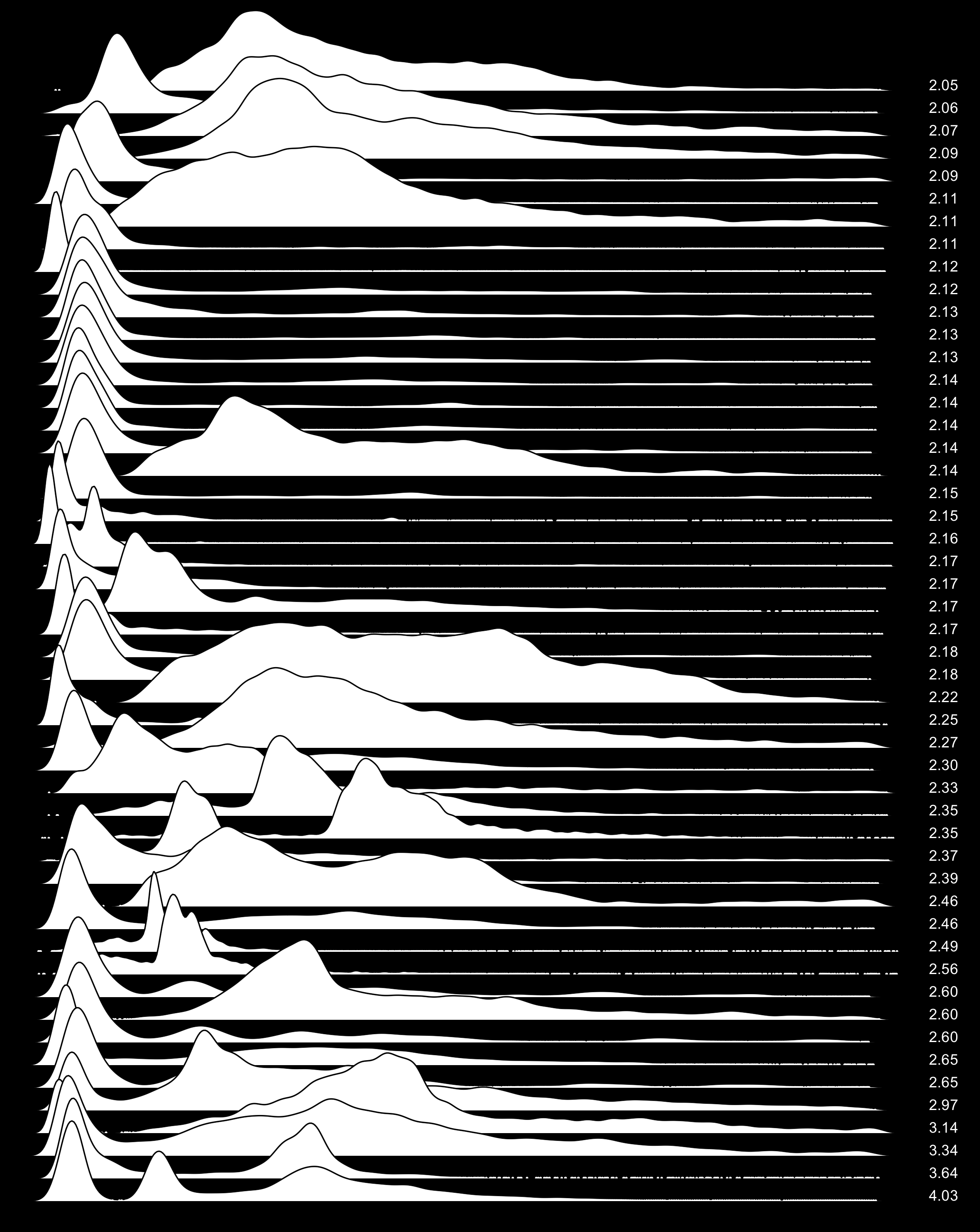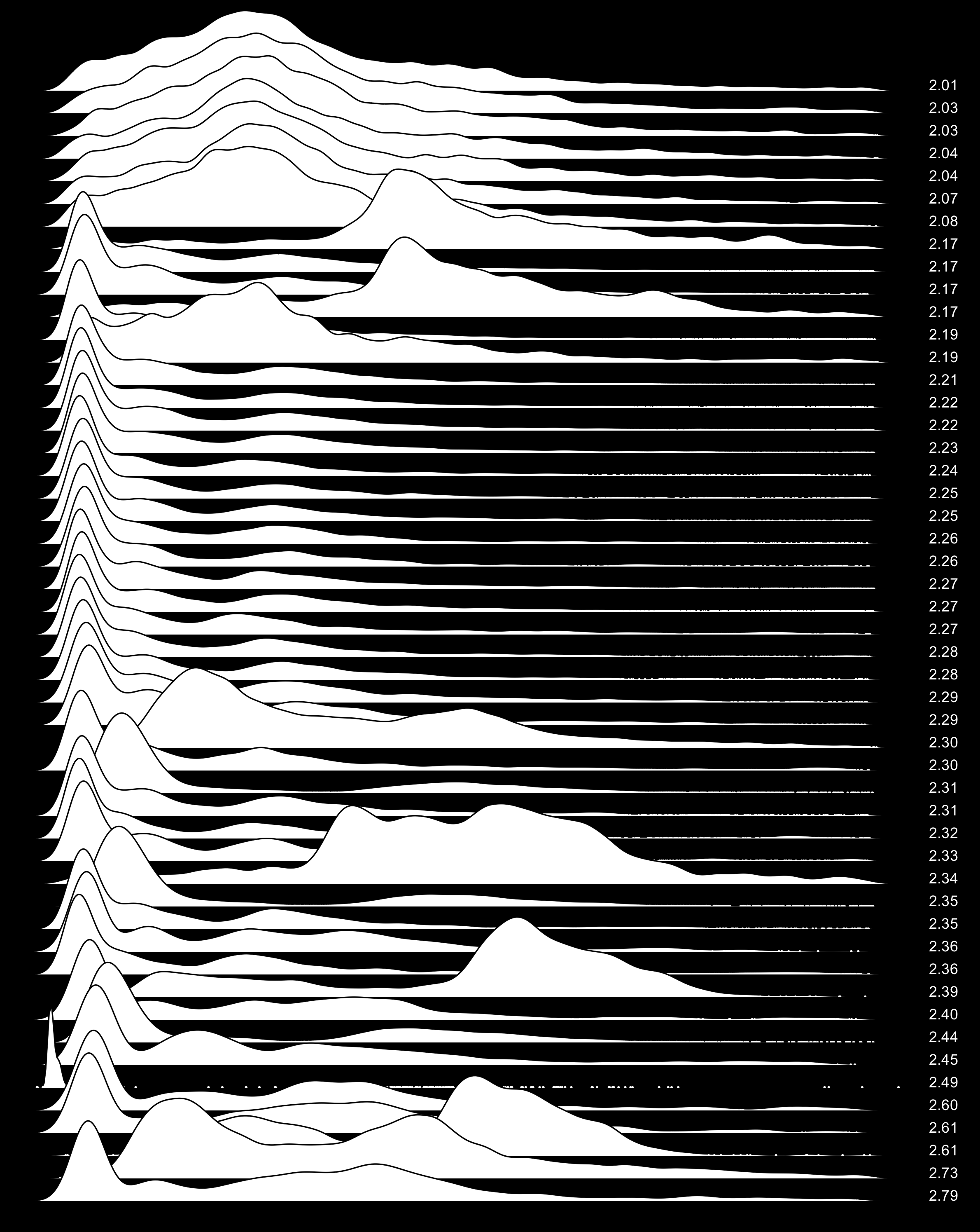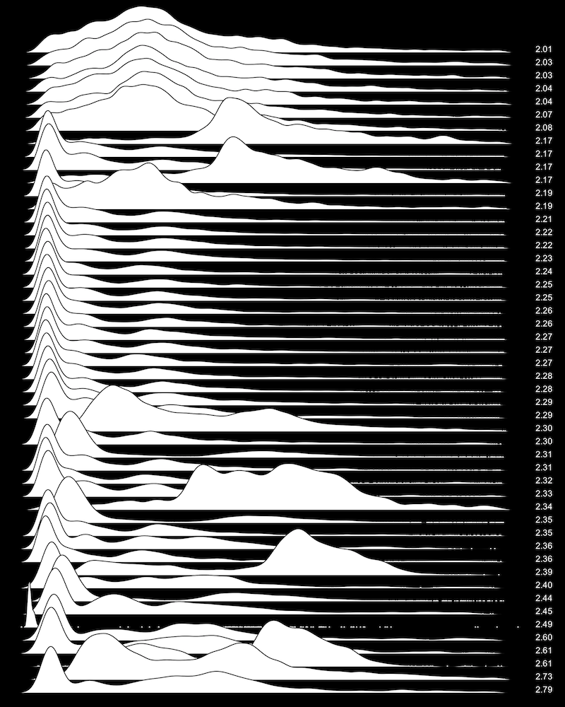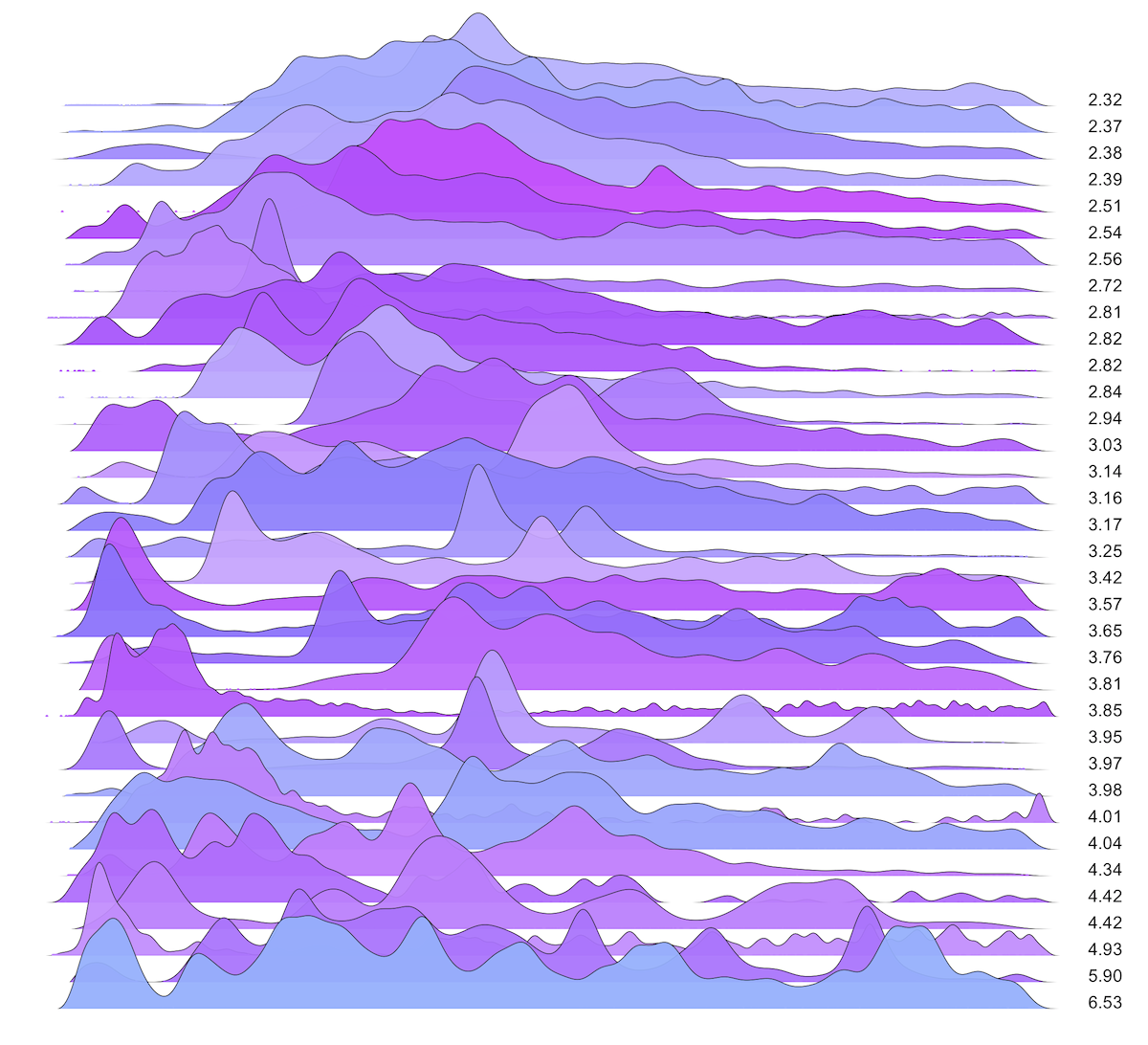 These are waterfall plots of overlapping frequency trails, with the mvalue on the right. Each is a synthetic distribution from a collection I'm using to test modality detection. Since these often overlap, I've randomly colored them for differentiation, and also added a little transparency here so that background detail can still be seen if you look carefully.