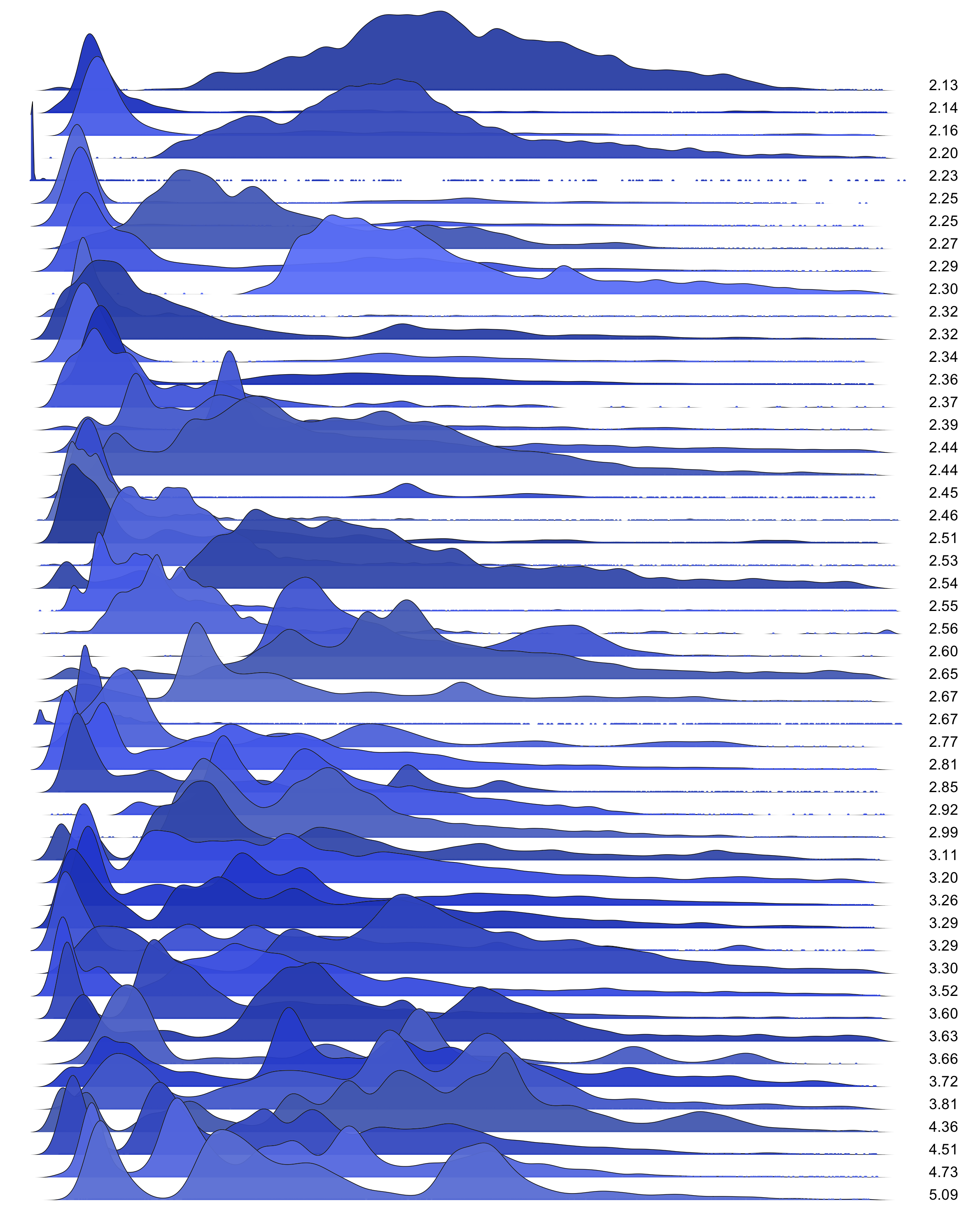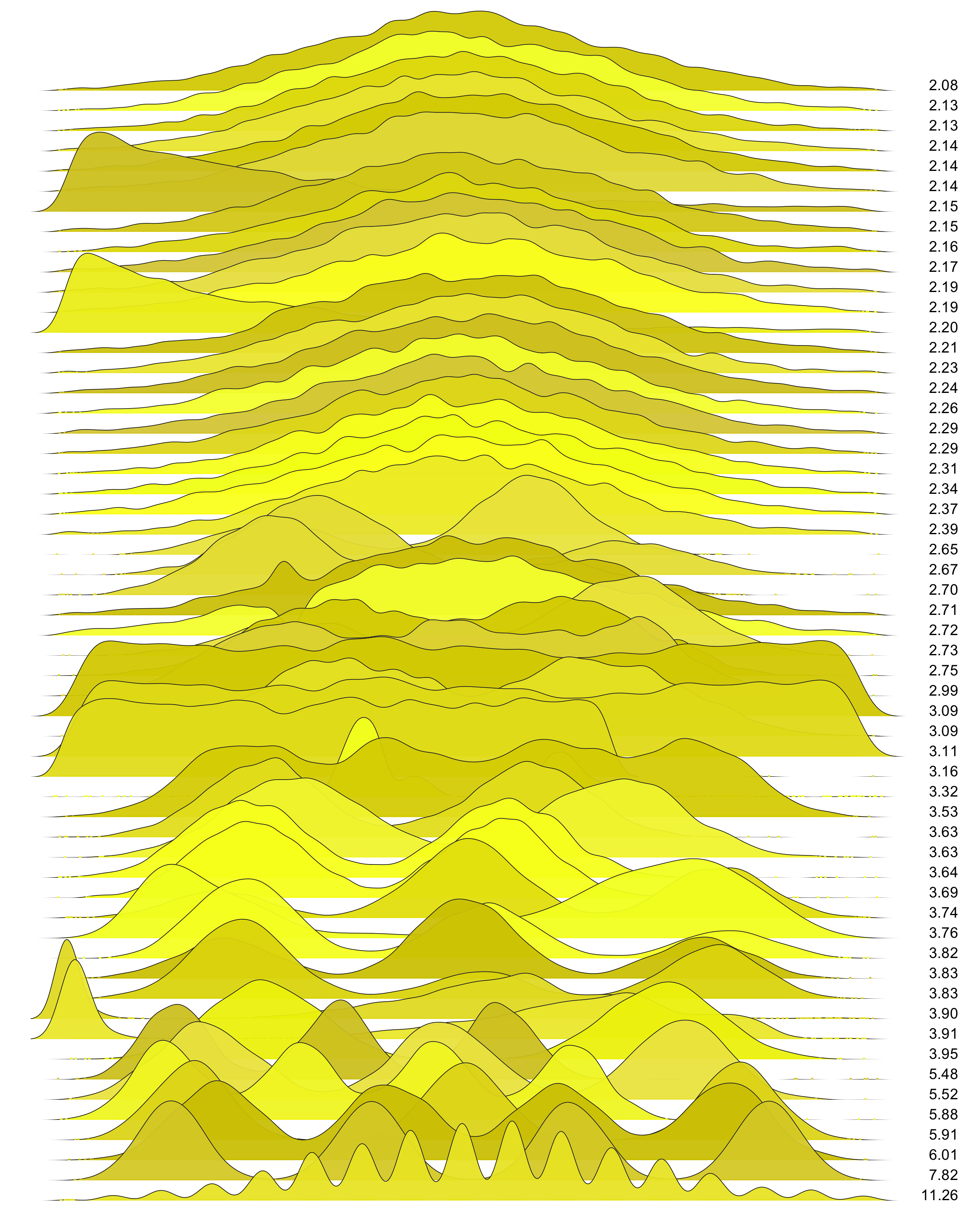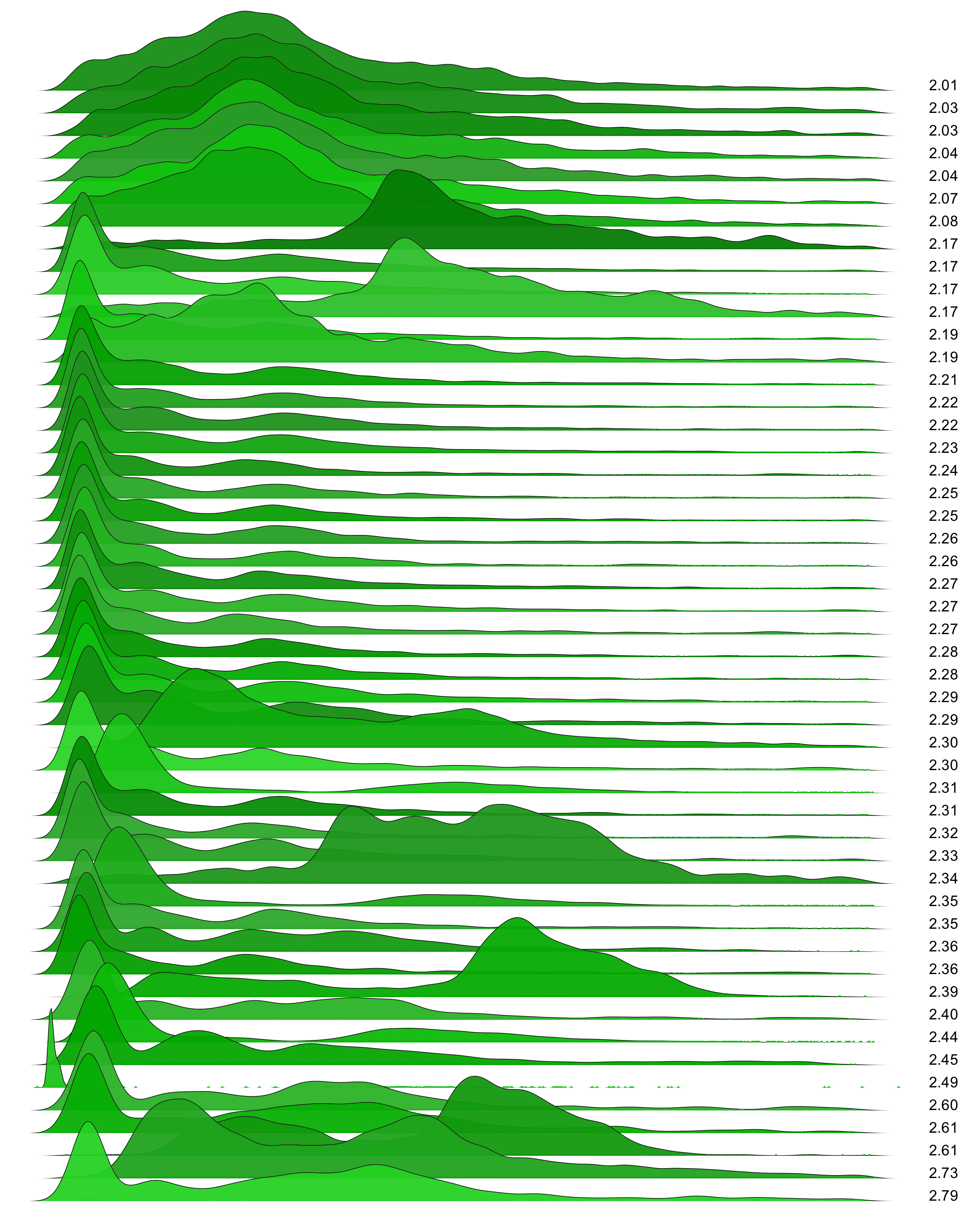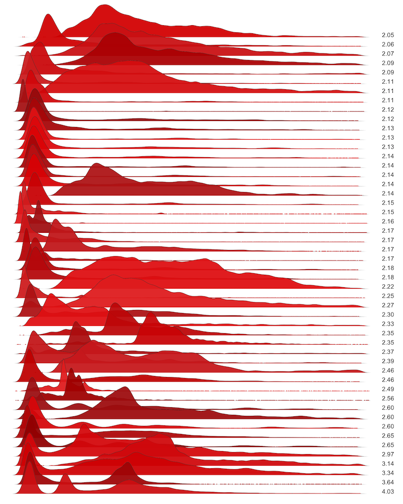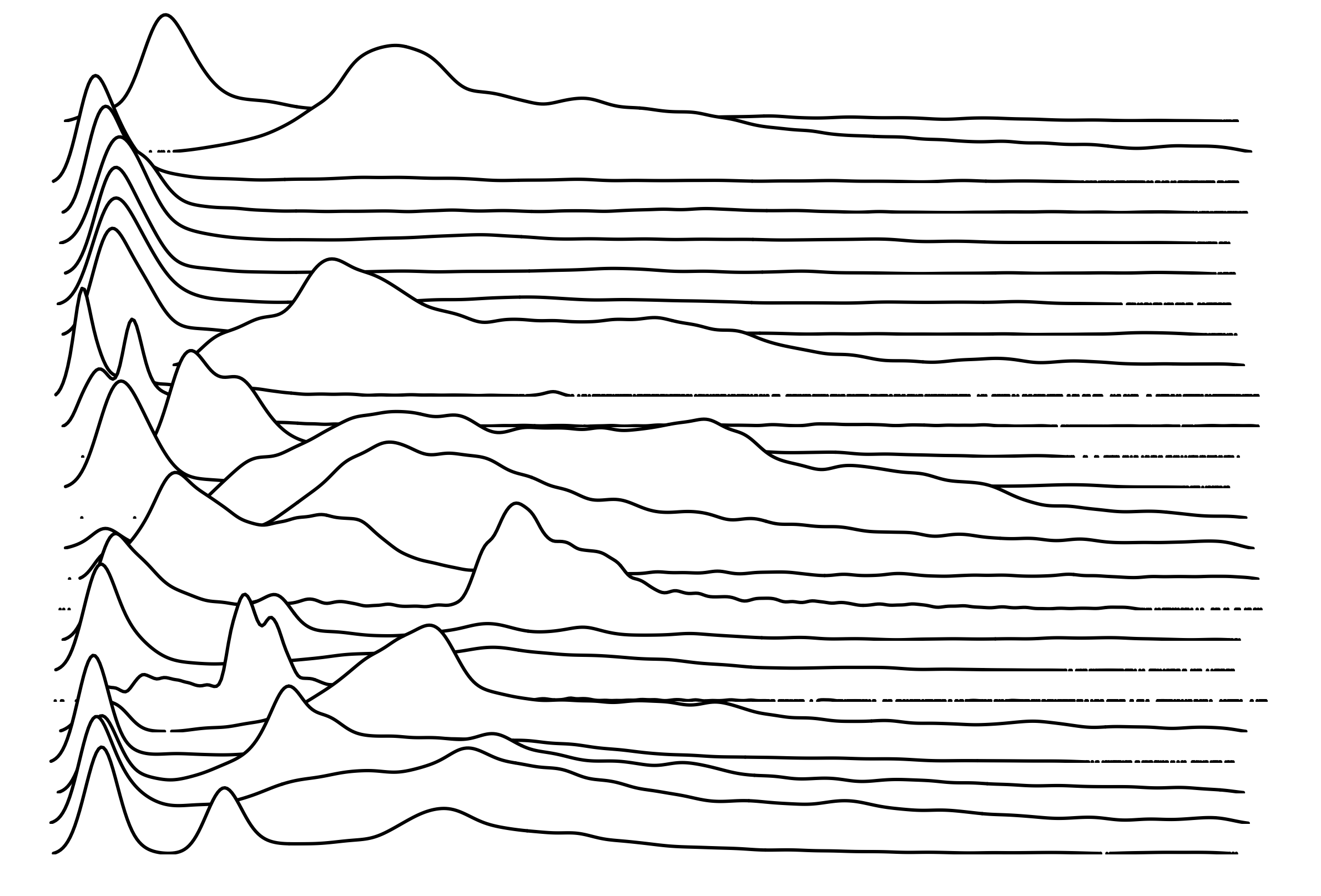 These are waterfall plots of overlapping frequency trails, with the mvalue on the right. Each is a synthetic distribution from a collection I'm using to test modality detection. Since these often overlap, I've randomly colored them for differentiation, and also added a little transparency here so that background detail can still be seen if you look carefully.
