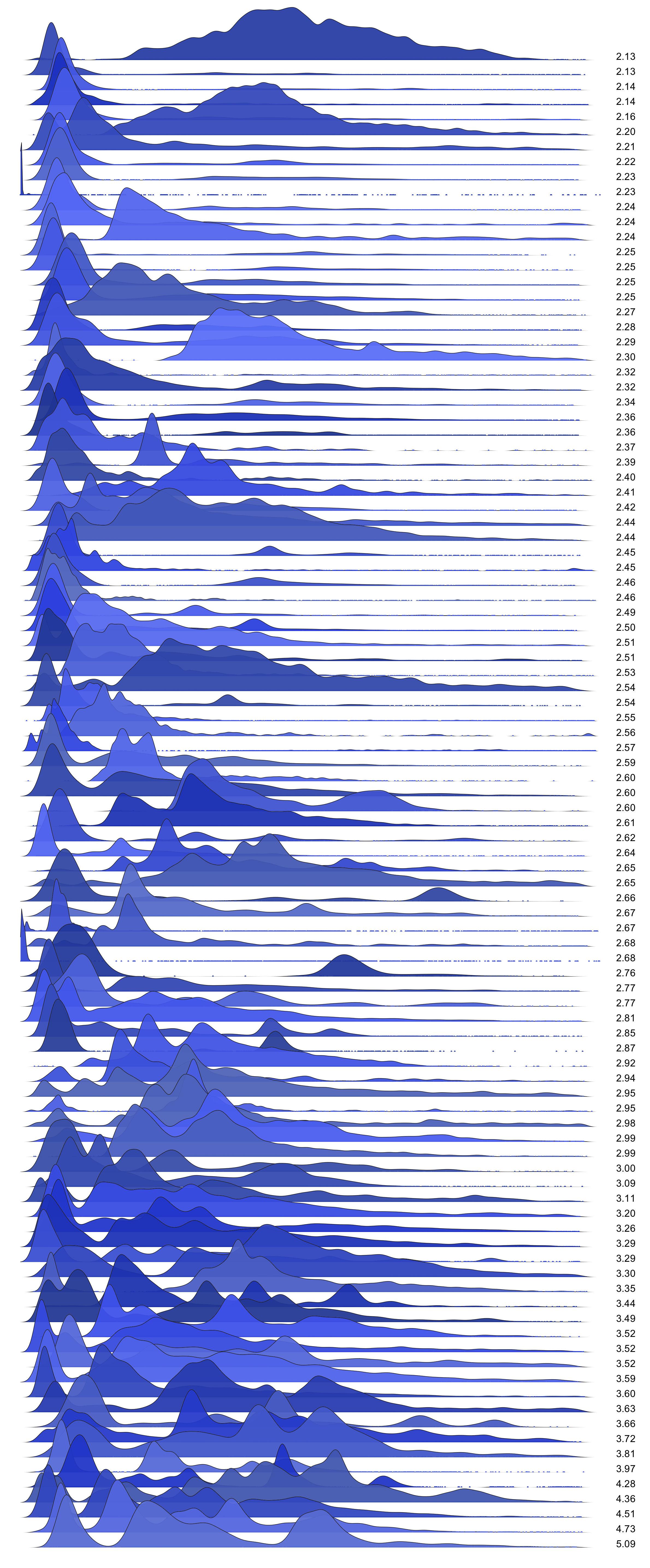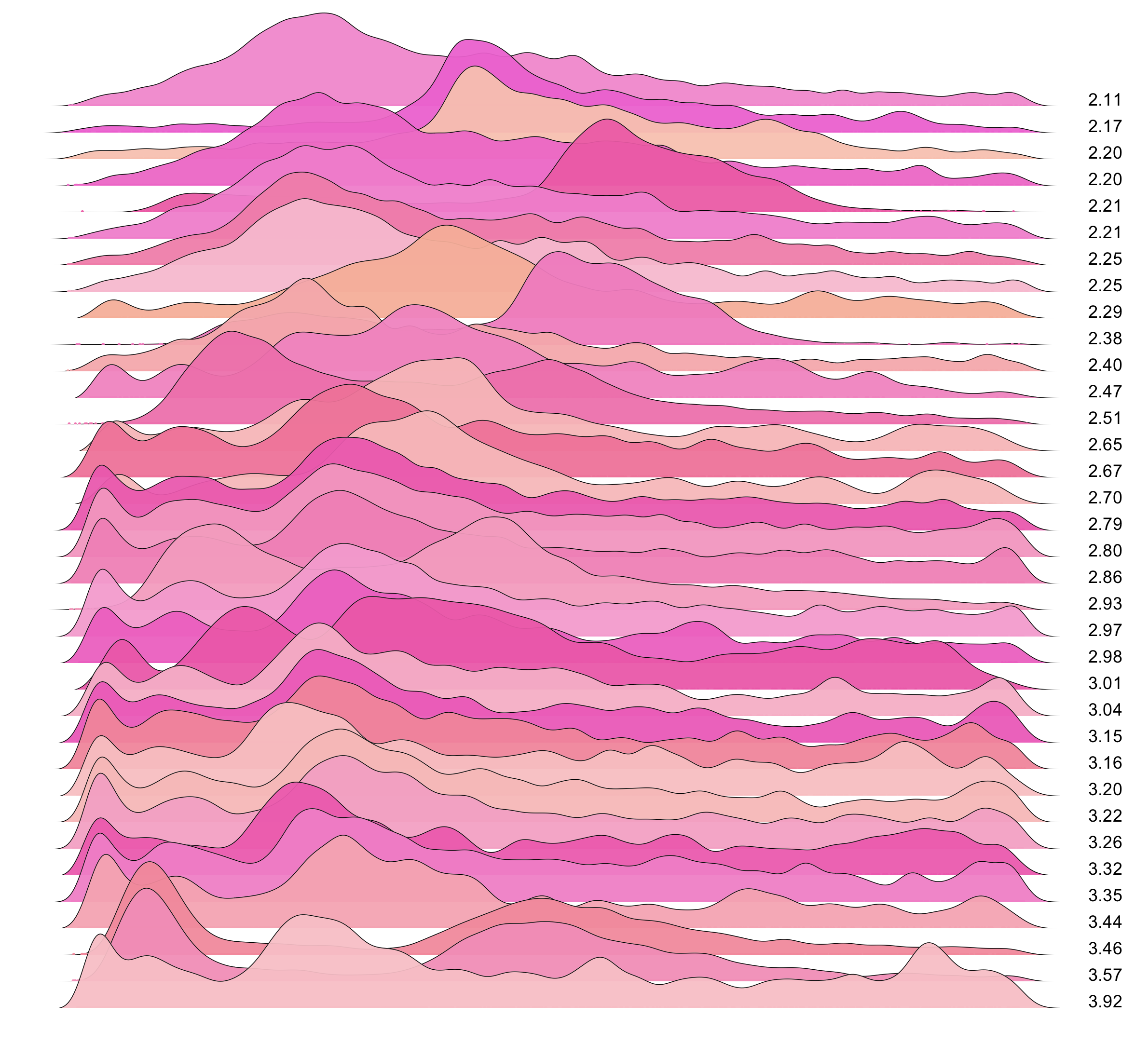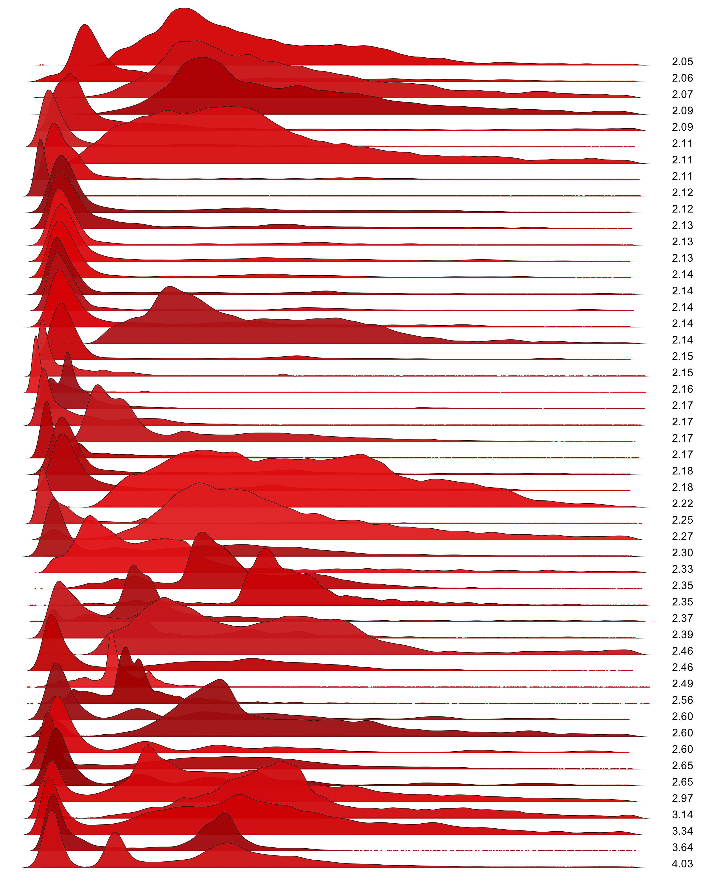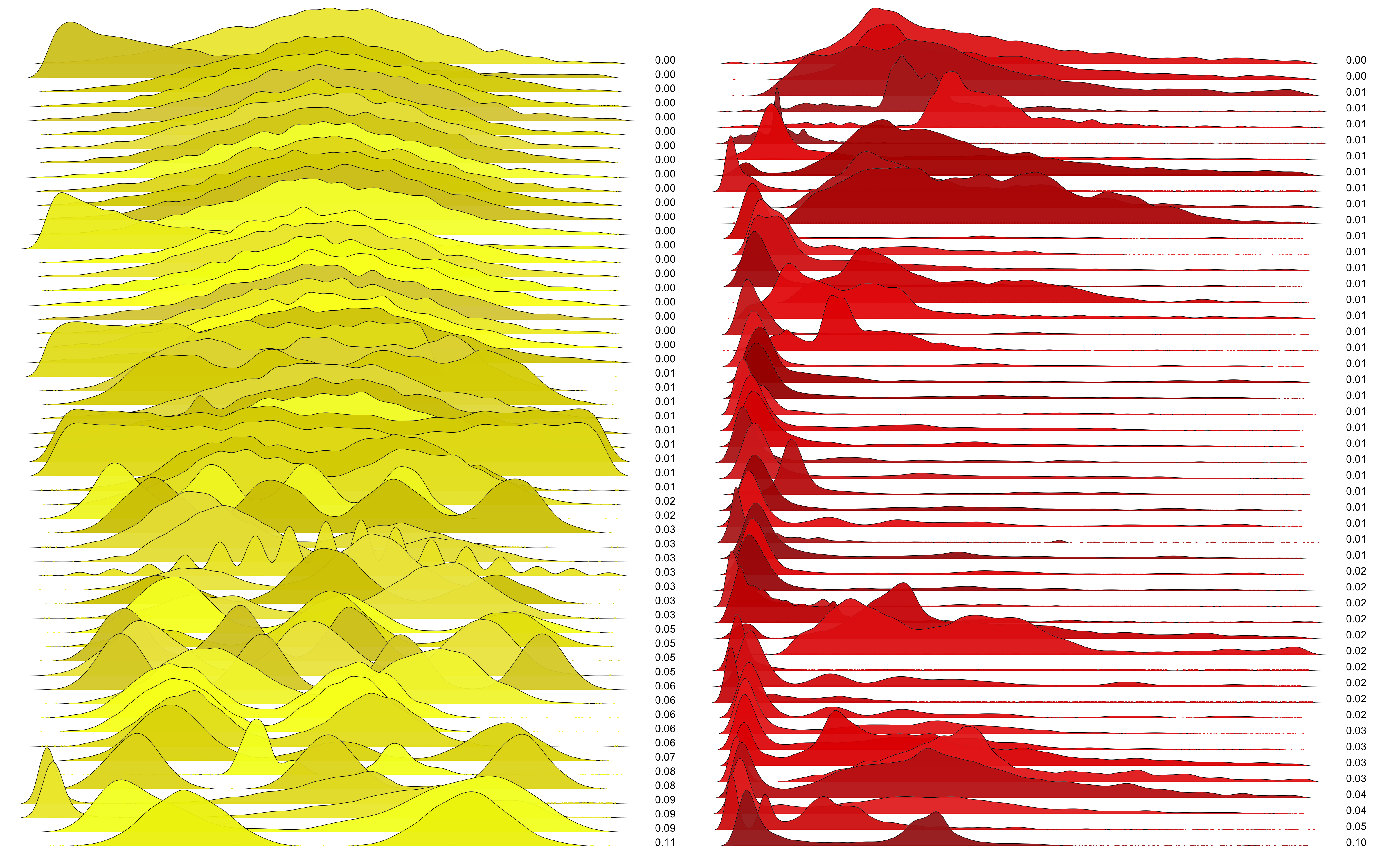 These are waterfall plots of overlapping frequency trails, with the mvalue on the right. Each is a synthetic distribution from a collection I'm using to test modality detection. Since these often overlap, I've randomly colored them for differentiation, and also added a little transparency here so that background detail can still be seen if you look carefully.