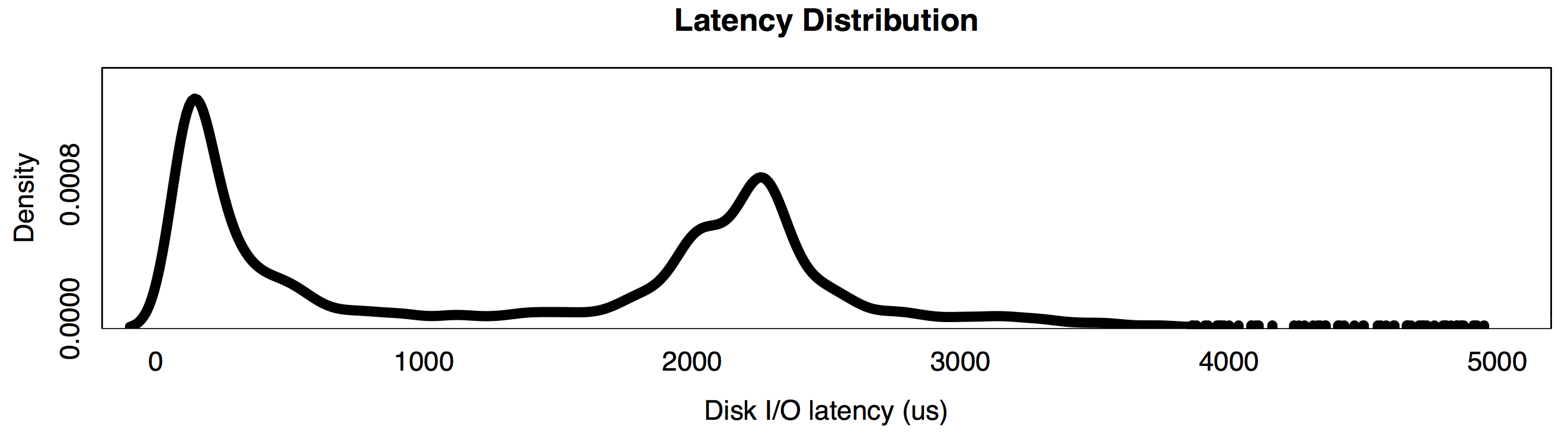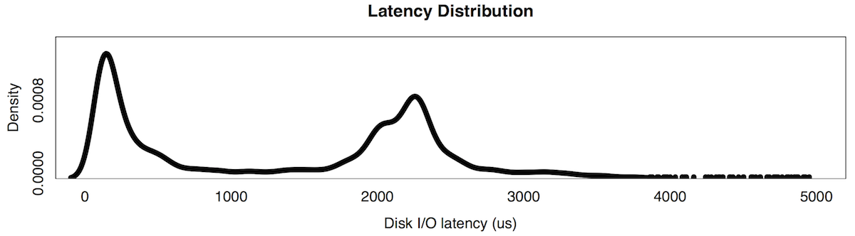 The height of each column shows how many I/O occurred in the latency range (x-axis). The shape of this histogram shows two modes (peaks): one at 0 - 200 us, and another at 2.2 to 2.4 ms.