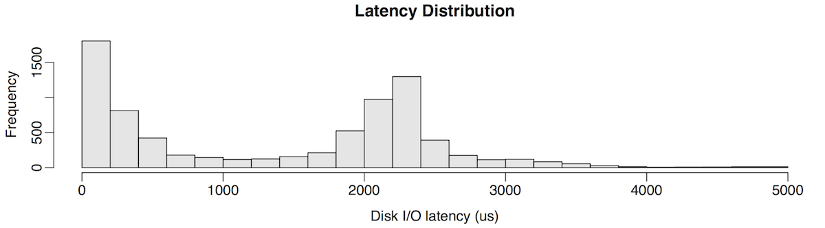 As an example, the following DTrace program prints a power-of-2 histogram of disk I/O latency every second, and pipes this to to awk, which calculates and adds the modal count beneath the DTrace histograms. This histogram type is better suited for this latency distribution, as the higher latency modes have higher variance, and the power-of-2 binning naturally groups them together.