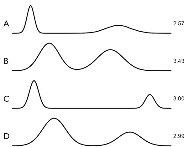 The problem this addresses is with multiple modes with different degrees of variance. Consider the density plots on the right. A) Shows a bimodal distribution where each mode is equal in numbers of samples, however, the right mode has a greater variance, lowering its height in this density plot, and lowering the mvalue to 2.57. This low height is an artifact of the small kernel density estimate bandwidth. B) shows the same distribution as (A), but with a much larger bandwidth (smoothing), which lowers the left mode, which raises the relative height of the right mode. This produces a higher mvalue, better matching the known distribution. C) is an example where the right mode has half the samples as the left, and the mvalue of 3.00 is expected. D) shows the same distribution as (C), with a greater bandwidth, which has not really changed the mvalue (good).