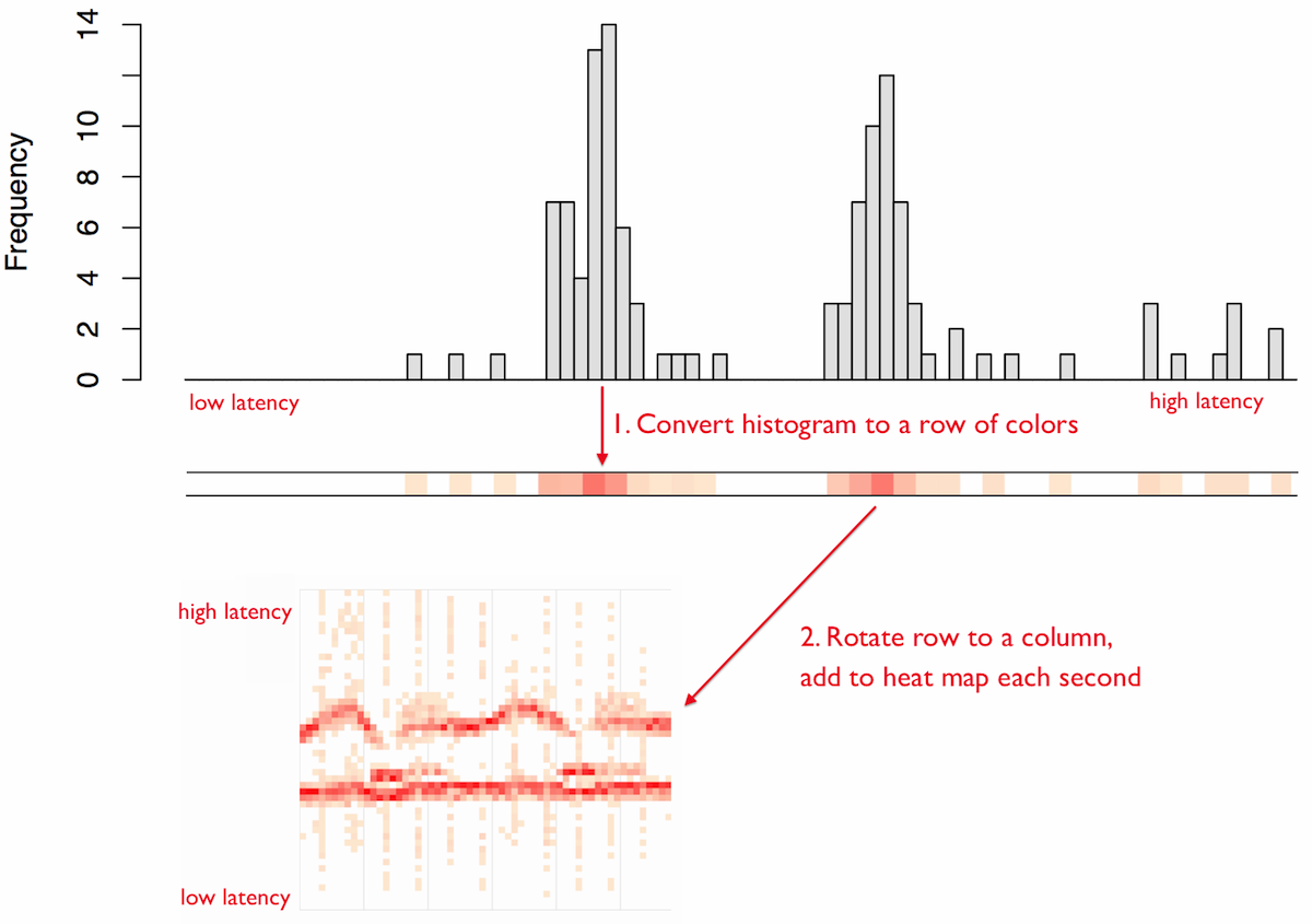 It may already be obvious how these work. Each frame of the histogram animation becomes a column in a latency heat map, with the histogram bar height represented as a color: