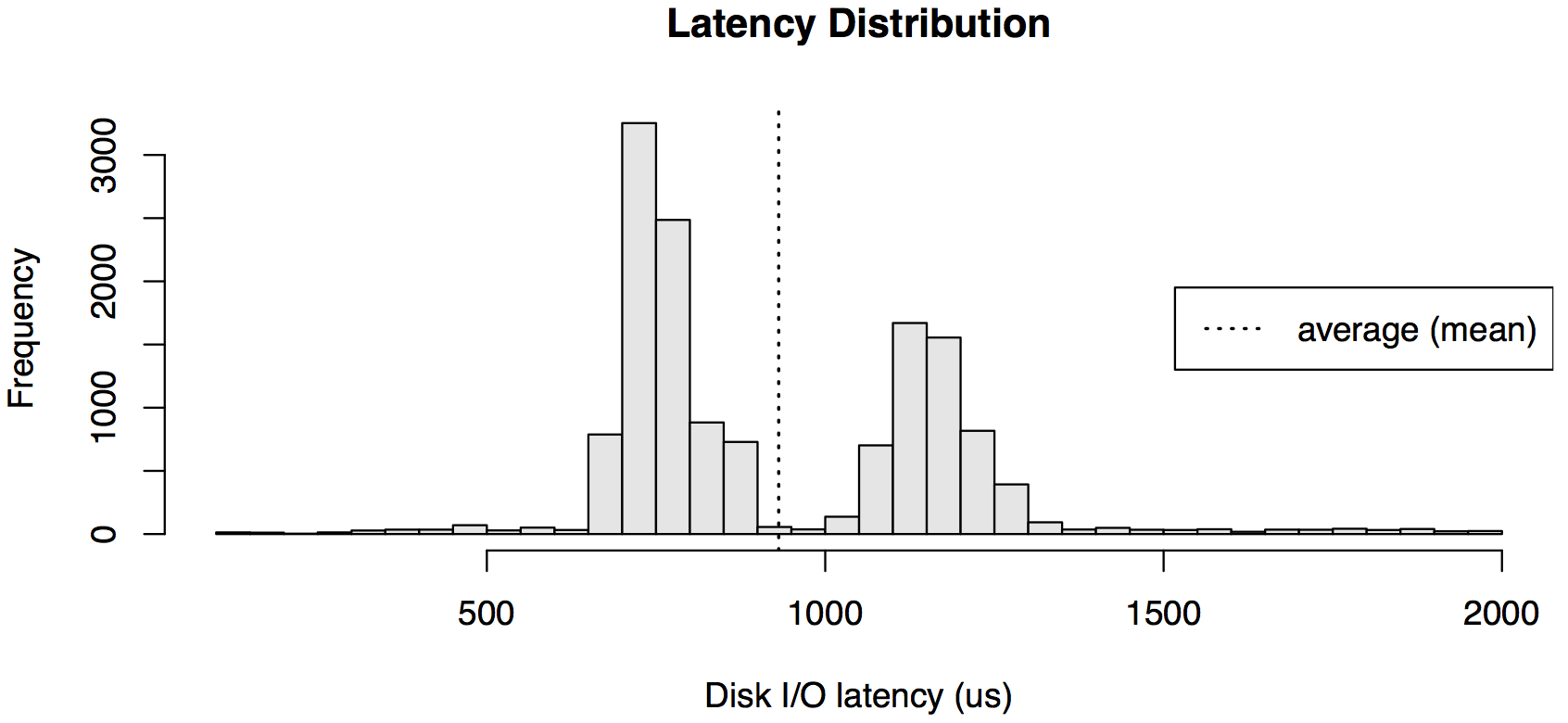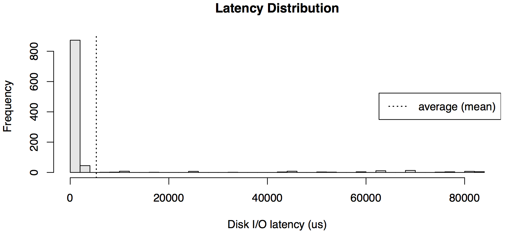 This shows that the average has been dragged up by latency outliers: I/O with very high latency. Most of the I/O in the histogram was in a single column on the left.