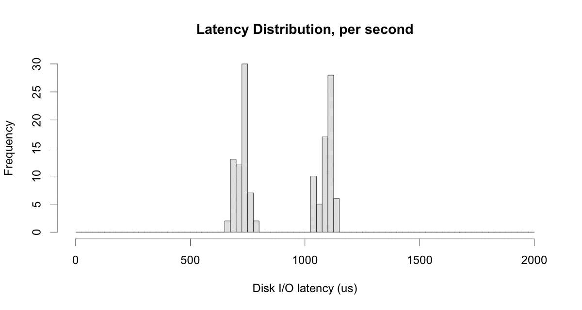 But there is still more hidden here. The average latency reported by iostat hinted that there was per-second variance. This histogram is reporting the entire two minutes of iosnoop output.