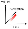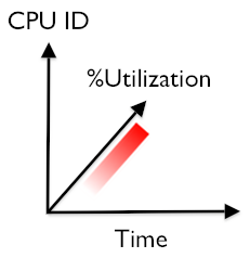 Finally, the device utilization heat map (aka "heatmap") uses a column quantization to visualize utilization in three dimensions: time (x-axis), percent utilization (y-axis), and number of CPUs (z-axis, color saturation) within the time/latency range. This is perhaps the most useful visualization that I've created to date. Bryan Cantrill first developed it into Sun Storage Analytics while we worked on the advanced products team at Sun Microsystems. I mentioned this towards the end of my ACMQ article on Visualizing Latency under the heading "Other Applications", which summarizes the concept: