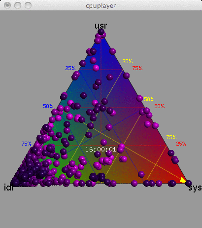 The triangle shape leaves much room unused in the top corners, which may become more noticeable if multiple ternary plots were drawn (instead of the animation). Note that a rectangular x-y plot of %usr and %sys would have a similar degree of unused space for the triangular area where %usr + %sys was greater than 100.