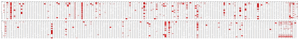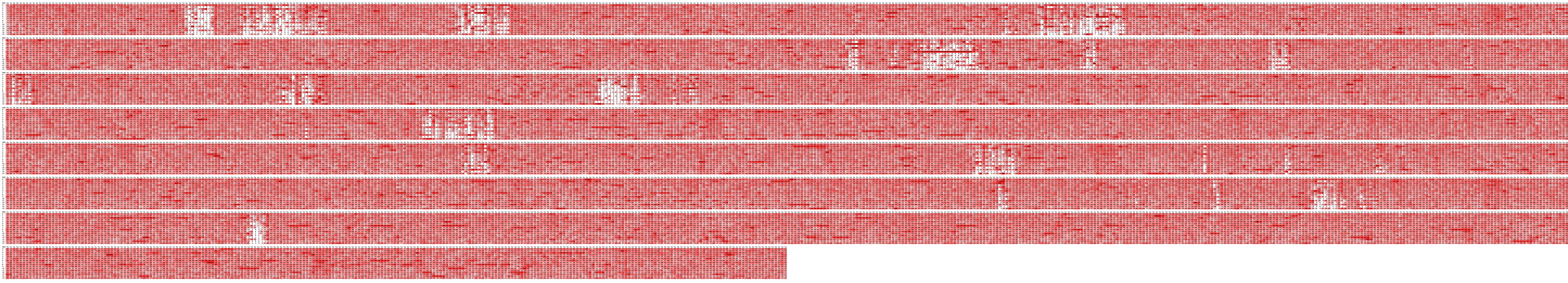 Unlike the mpstat(1) server summary, this time the font size is (almost) large enough to read. In a few places a single CPU hits 100% utilization, visible as an unbroken line of digits (100100100).