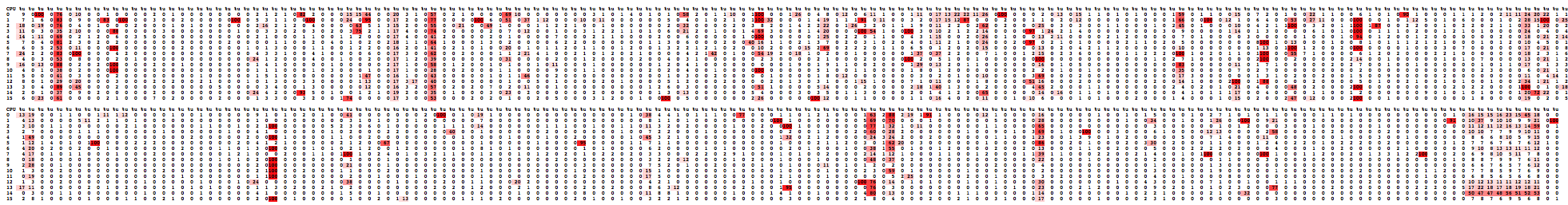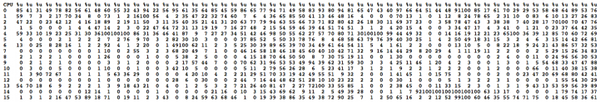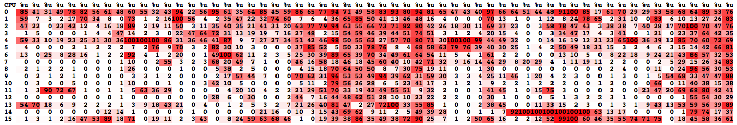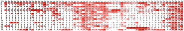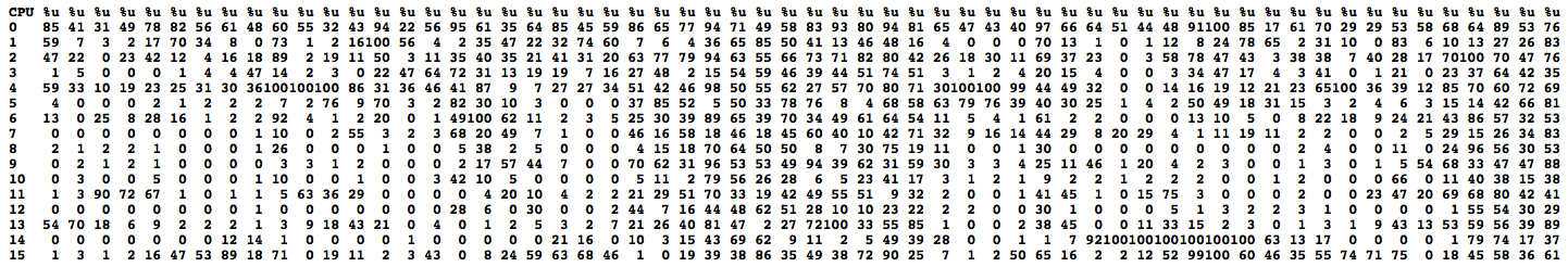 I'll now visualize just the per-CPU utilization values, per-second, as a table of values. This strips the mpstat(1) output down to just the (inverted) %idl column, which provides a better sense of the volume of the utilization data we are trying to understand.