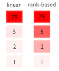 The actual algorithm used here is non-linear, which helps identify subtle patterns. A linear algorithm could be used that makes the bucket with the highest CPU count the darkest shade available, and the bucket with the lowest CPU count (probably zero) the lightest, and all buckets in-between scaled linearly by those. In practice, this can wash out details as some buckets (in the case of CPU utilization, the idle buckets representing 0% utilization) would have such a high CPU count that the others only use much lighter shades - and appear washed out. An example of linear application of saturation based on value is on the right.