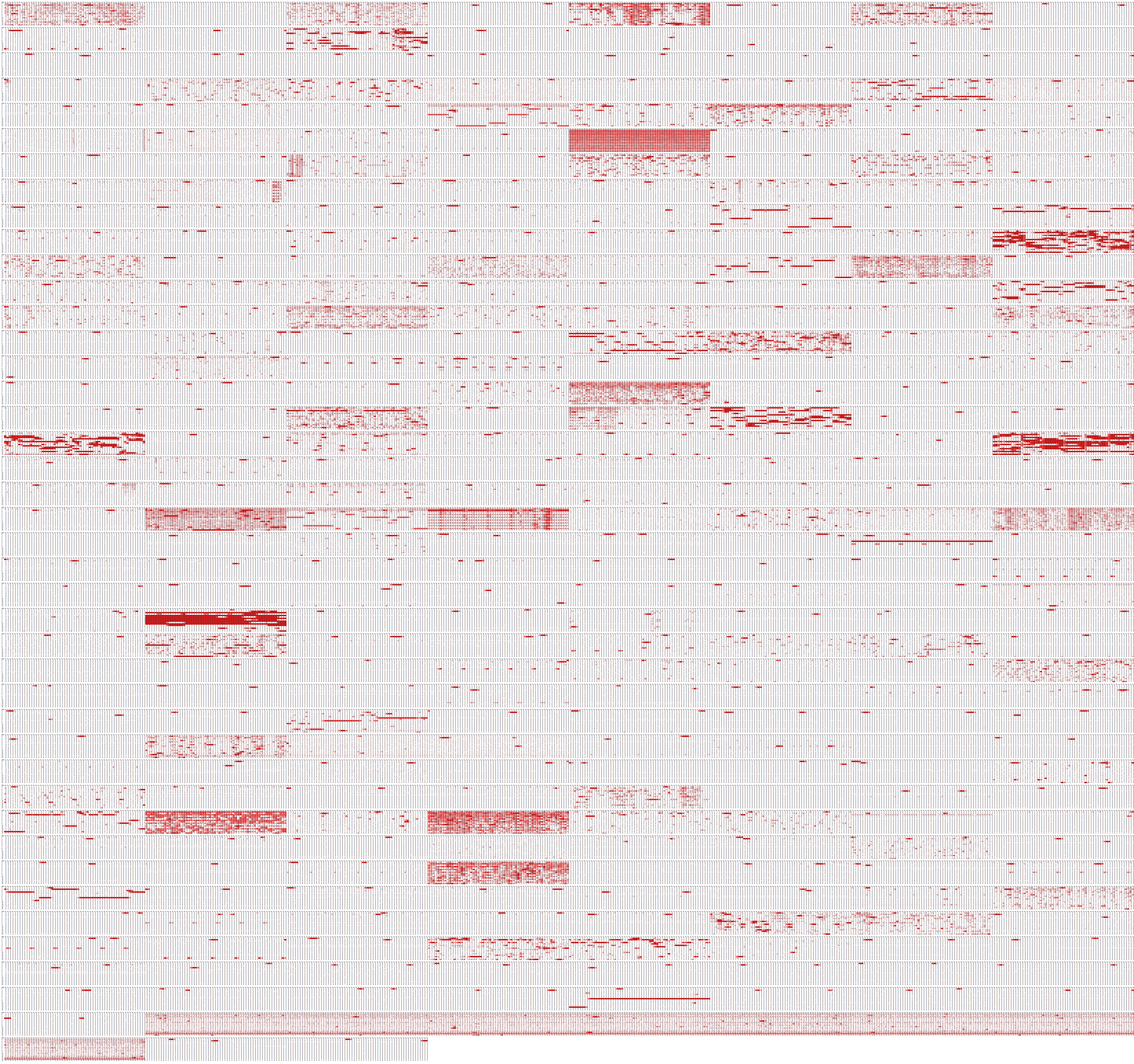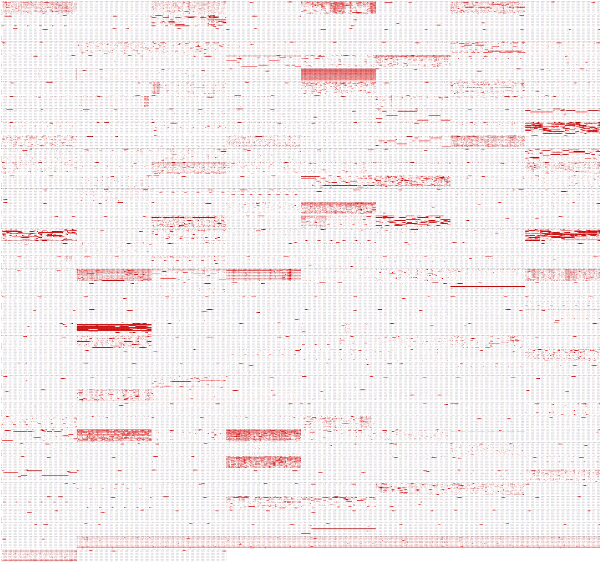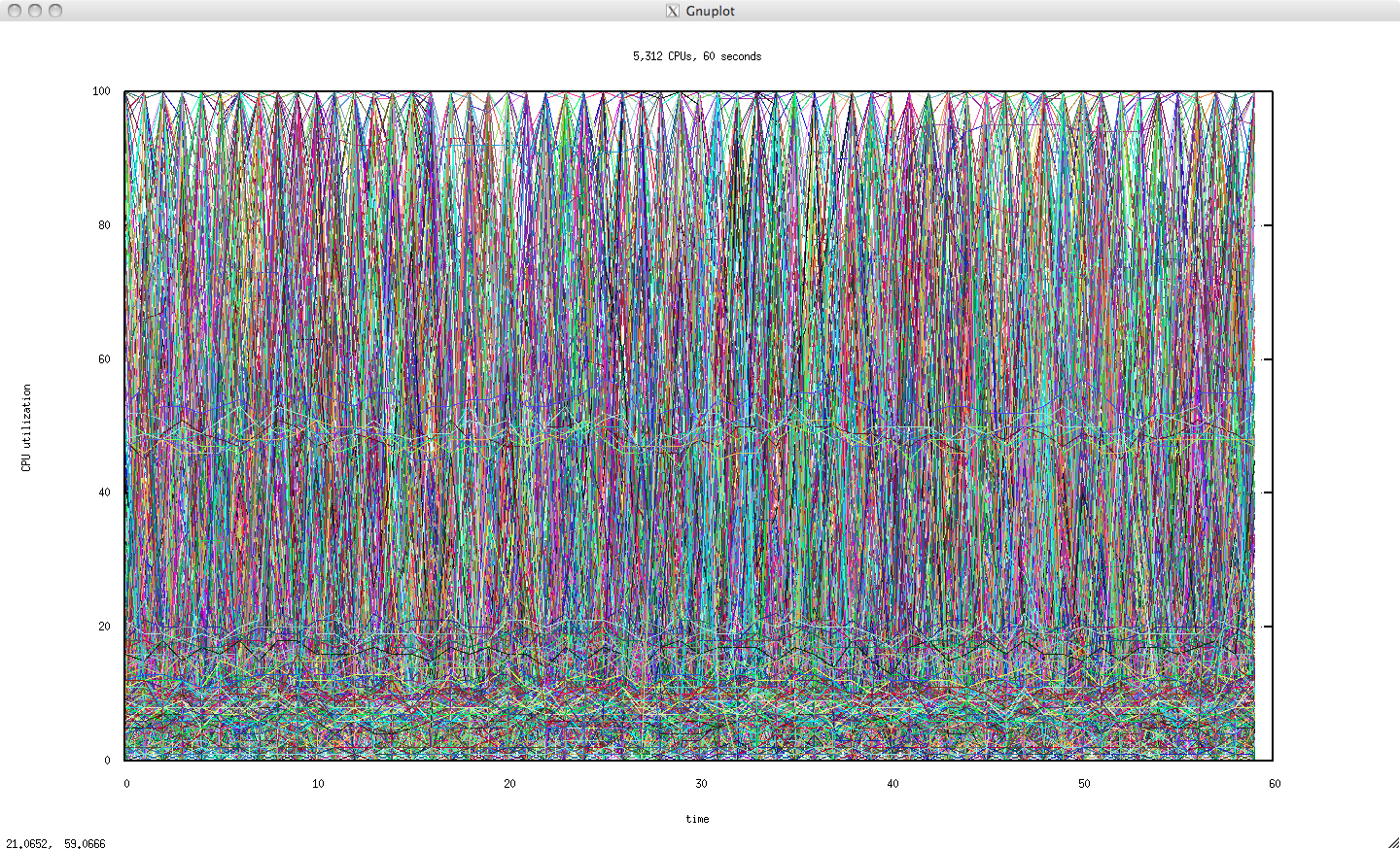 The utilization data for each second is shown by one frame, which consists of just the 5,312 CPUs as highlighted pixels (similar to before, but the digits were dropped). This animation has been sped up to 10x normal time, and shows 20 seconds in a loop (click for the full 60 seconds).