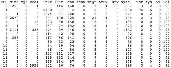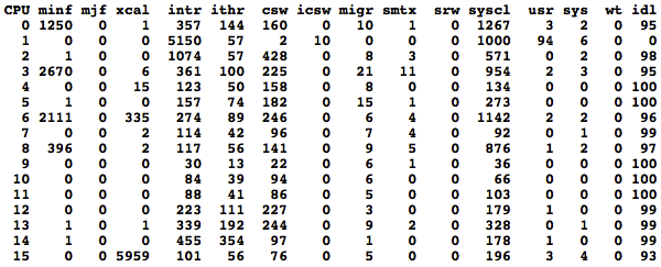 This one second summary shows 16 virtual CPUs. CPU 1 is at 100% utilization (calculated by inverting the last column, %idle), which can be evidence of a software scaleability issue (single hot thread).