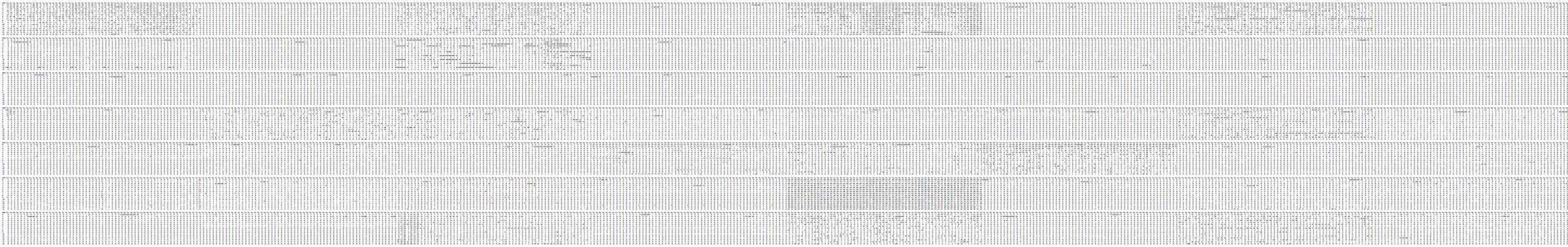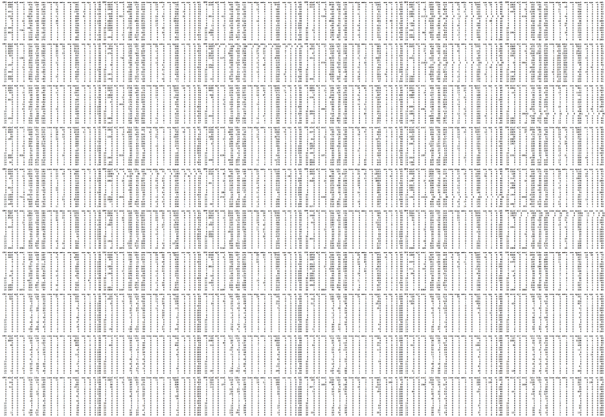 This image is more interesting than I would have guessed (click for high-res). Faint darker patterns are caused by areas with double- and triple-digit (100%) utilizations, where the digits themselves give a darkness effect. This differs from the mpstat(1) dark patterns, as these highlight utilization only.