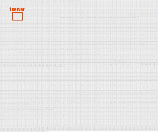 The data center image provides a great impression across all 332 servers. Were this to be used as a tool, the numbers could be dropped (the highlighting is sufficient) and it could be made interactive: mouse over servers for expanded details. However, scaling this much further will be difficult. This example has little more than 1 pixel per data element. If each server had 64 virtual CPUs instead of 16, the number of elements would increase by a factor of 4.