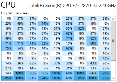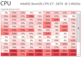 Microsoft Windows 8 will include this type of visualization in the Task Manager, to show instantaneous utilization values on systems with more than 64 virtual CPUs (logical processors). The screenshot on the right is from an MSDN blog post that explains the move. This shows 113 CPUs, and has a scrollbar to reveal more.
