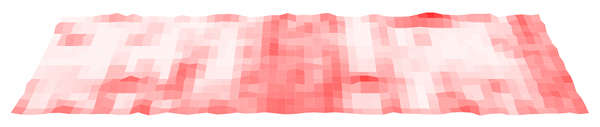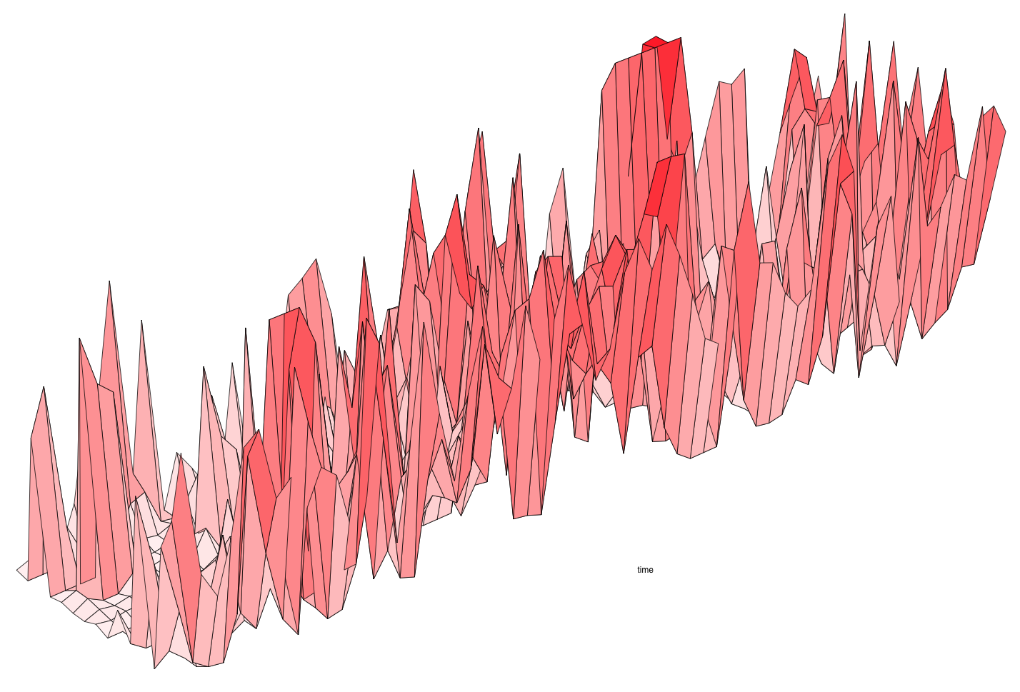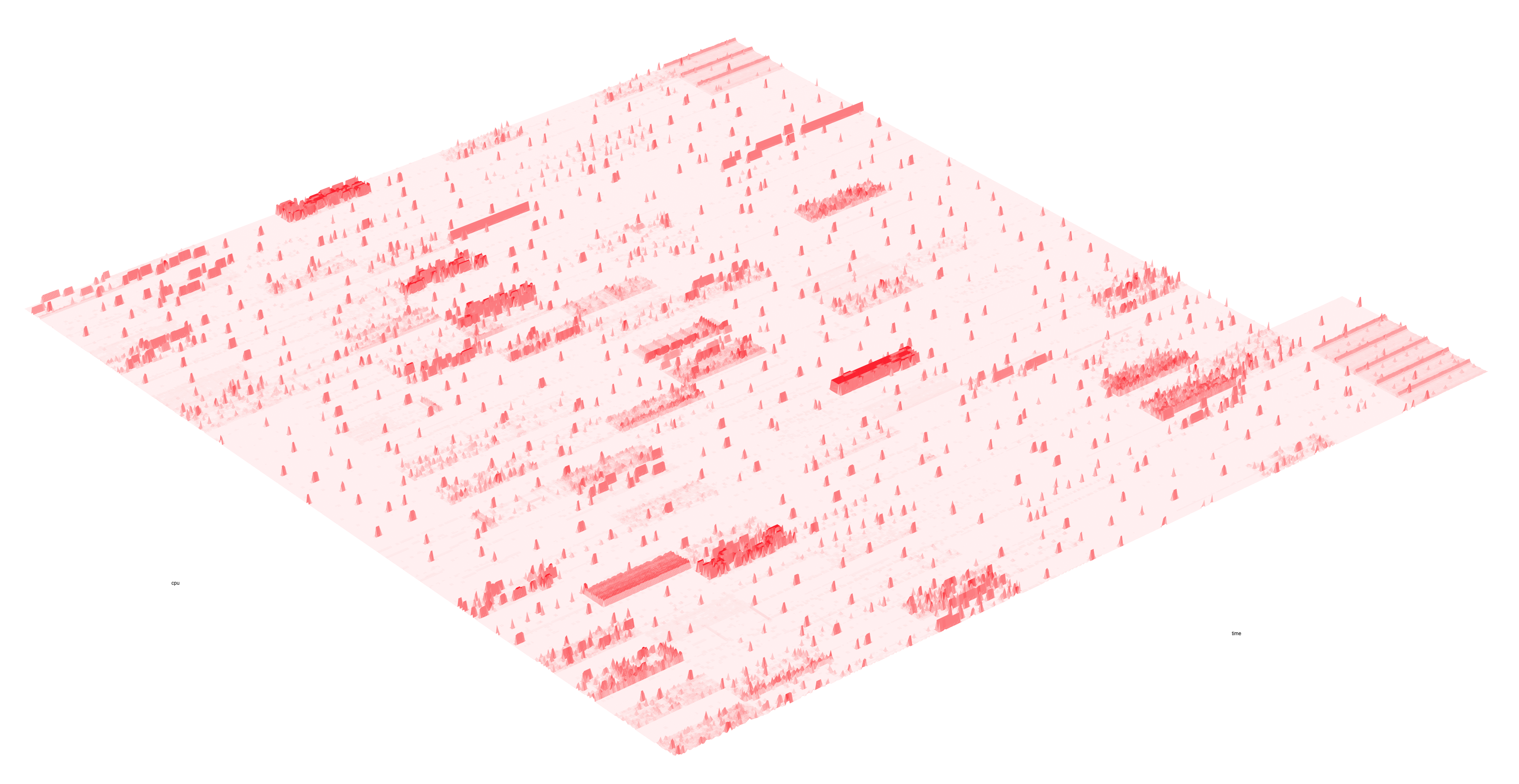 Time is the x-axis from left to right, CPU ID is the y-axis, and the z-axis (elevation) is the utilization value. This has also been colorized based on the utilization value, so, utilization is represented here by both elevation and color saturation.