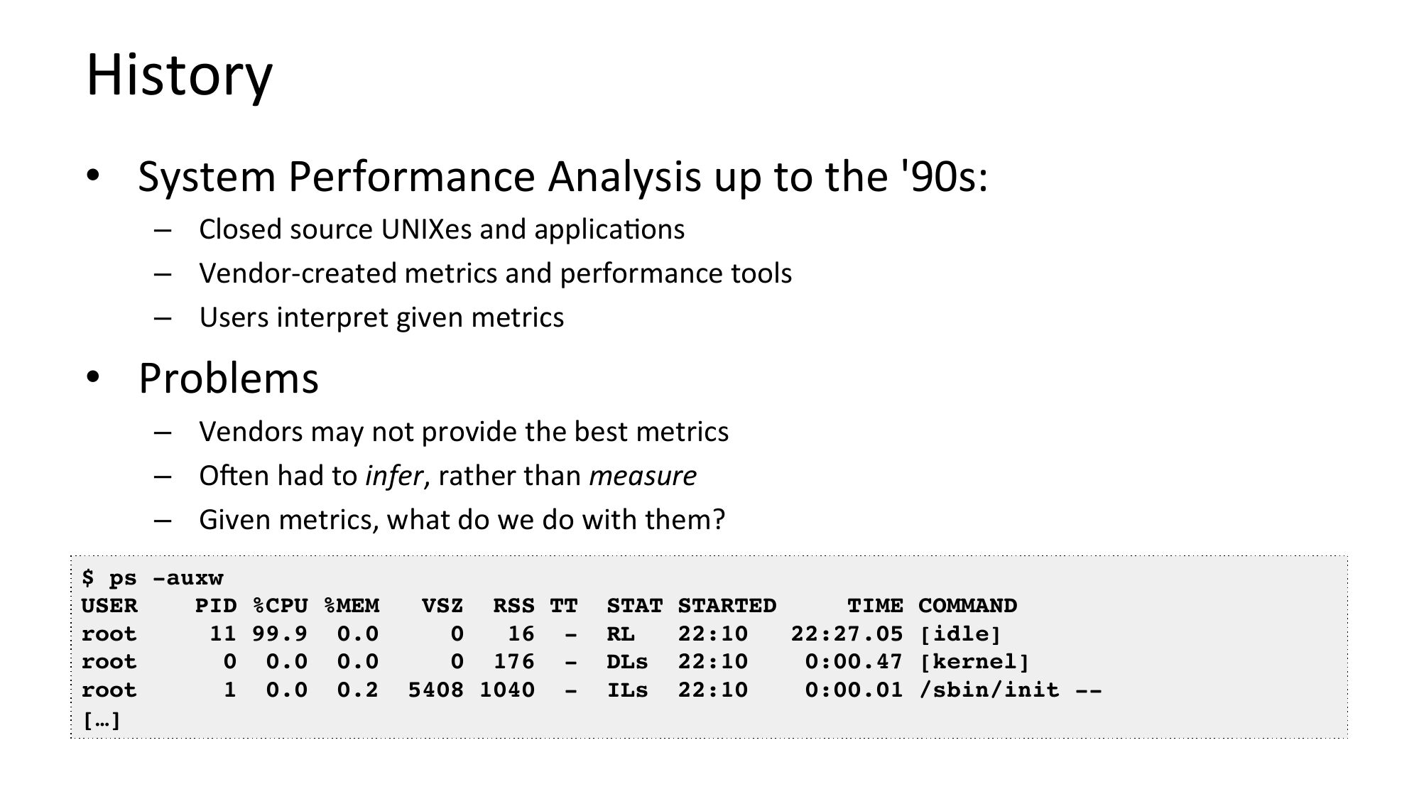 History • System Performance Analysis up to the '90s: – Closed source UNIXes and applicaNons – Vendor-created metrics and performance tools – Users interpret given metrics • Problems – Vendors may not provide the best metrics – ORen had to infer, rather than measure – Given metrics, what do we do with them? $ ps -auxw USER PID %CPU %MEM root 11 99.9 0.0 root 0 0.0 0.0 root 1 0.0 0.2 […] VSZ RSS TT 16 0 176 5408 1040 - STAT STARTED TIME COMMAND 22:10 22:27.05 [idle] DLs 22:10 0:00.47 [kernel] ILs 22:10 0:00.01 /sbin/init --slide 7: