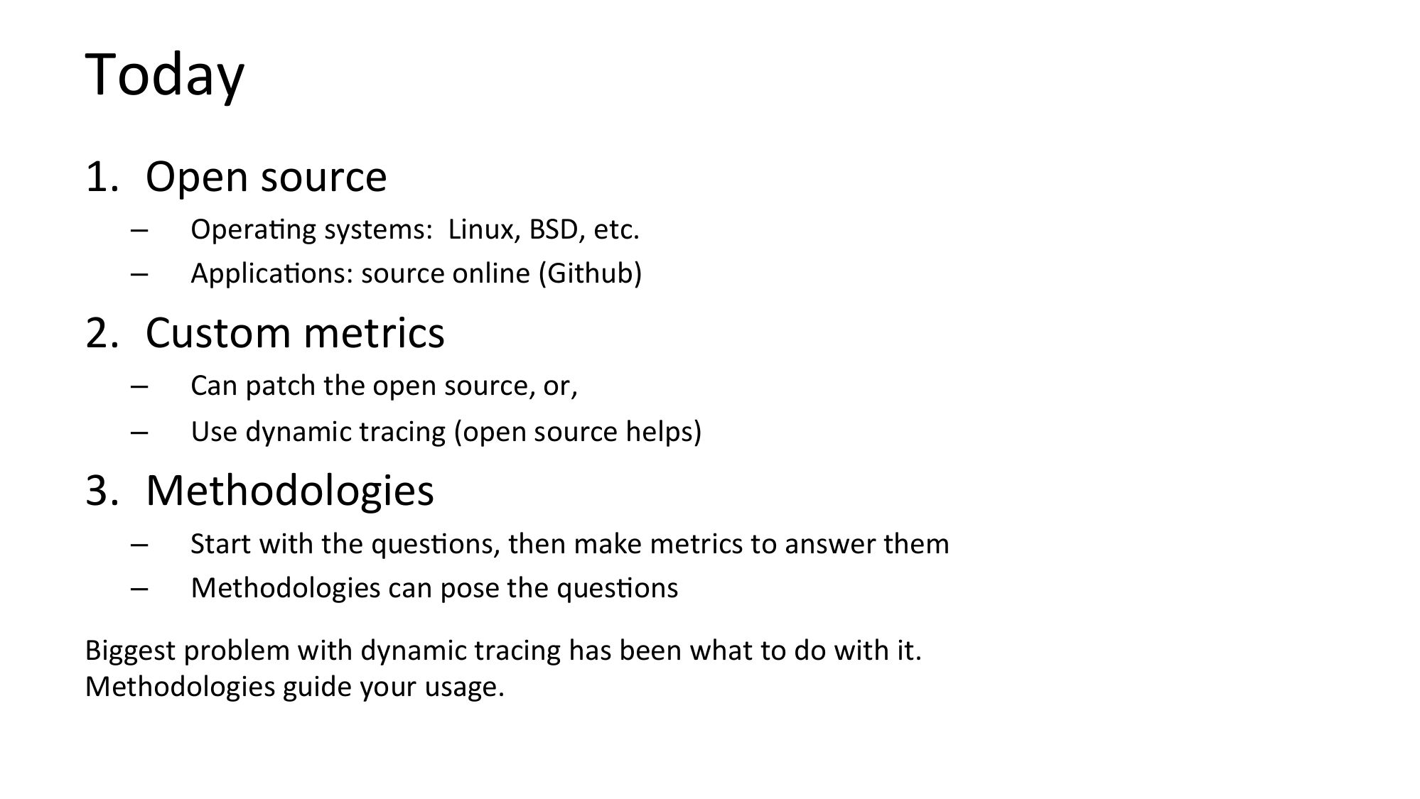 Today 1. Open source OperaNng systems: Linux, BSD, etc. ApplicaNons: source online (Github) 2. Custom metrics Can patch the open source, or, Use dynamic tracing (open source helps) 3. Methodologies Start with the quesNons, then make metrics to answer them Methodologies can pose the quesNons Biggest problem with dynamic tracing has been what to do with it. Methodologies guide your usage.slide 8: