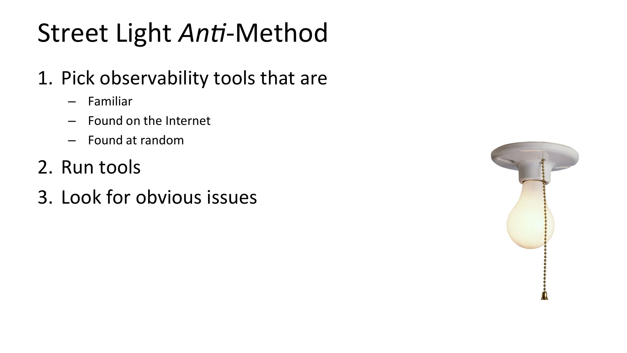 Street Light An2-Method 1. Pick observability tools that are – Familiar – Found on the Internet – Found at random 2. Run tools 3. Look for obvious issuesslide 11: