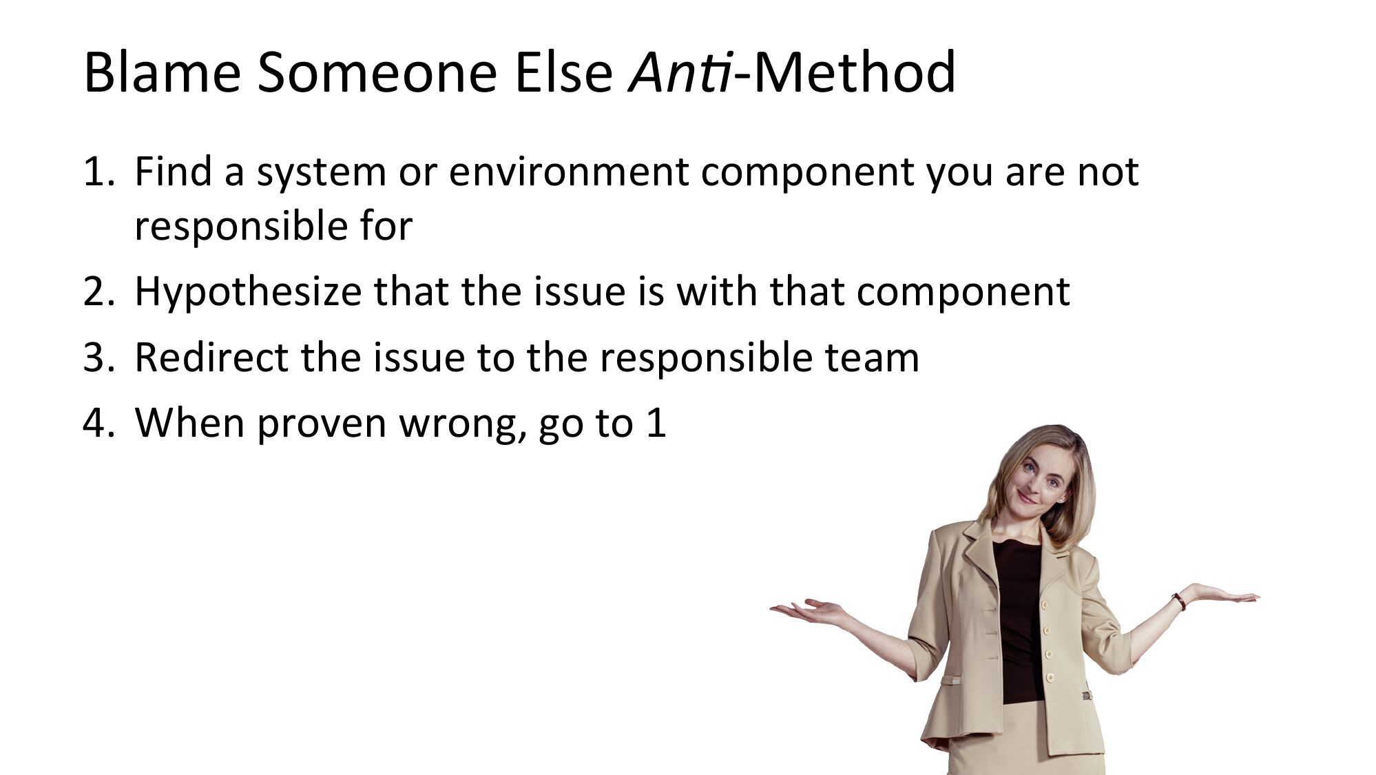 Blame Someone Else An2-Method 1. Find a system or environment component you are not responsible for 2. Hypothesize that the issue is with that component 3. Redirect the issue to the responsible team 4. When proven wrong, go to 1slide 13: