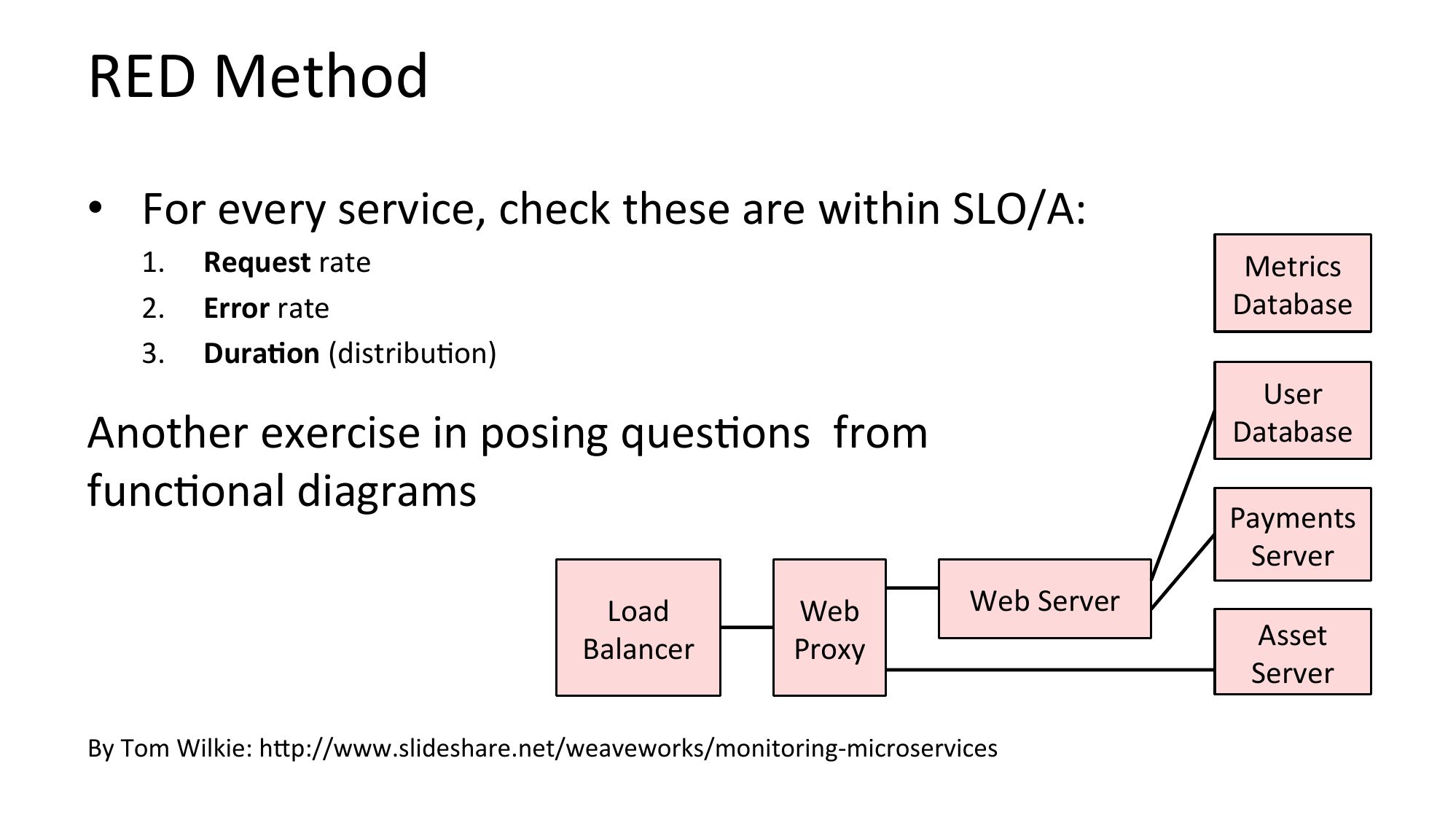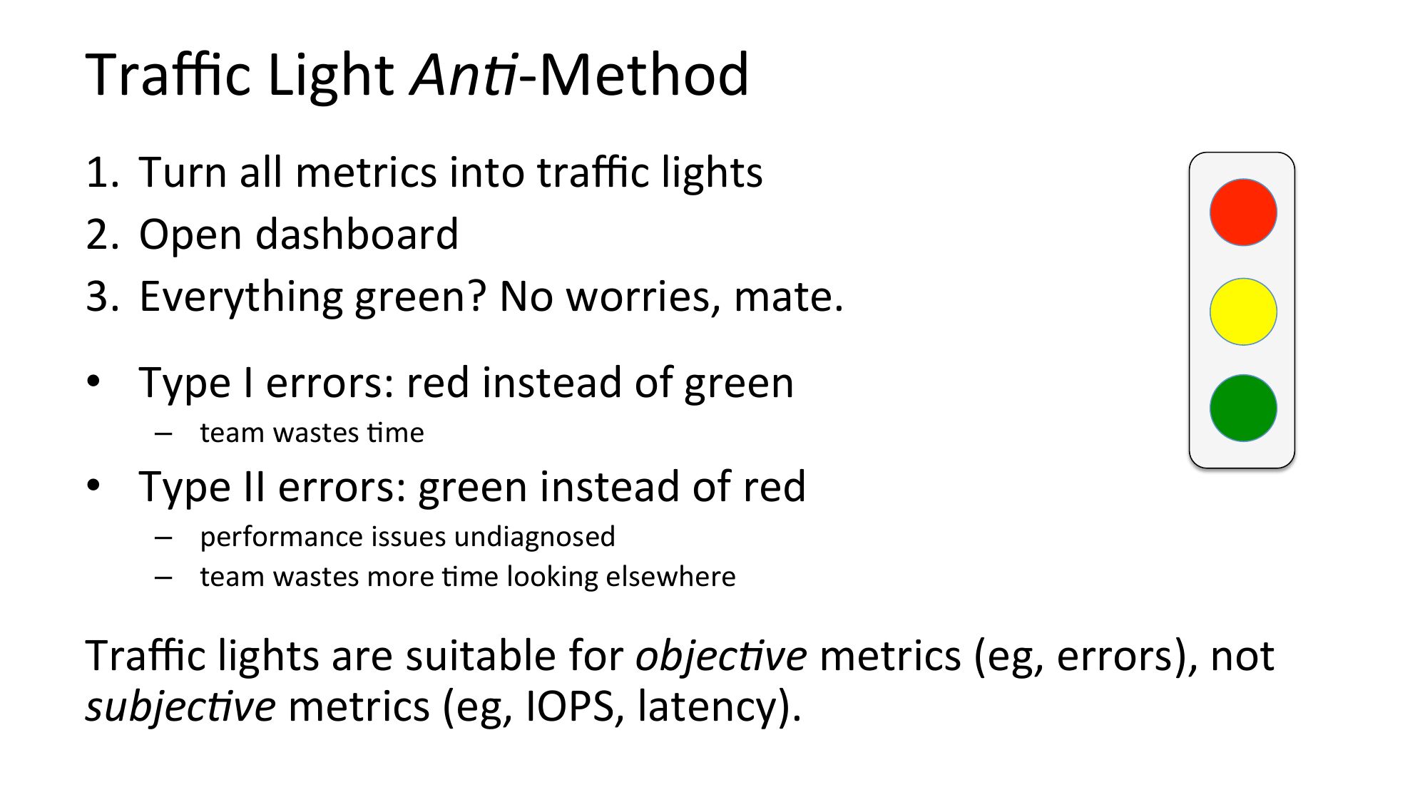 Traffic Light An2-Method 1. Turn all metrics into traffic lights 2. Open dashboard 3. Everything green? No worries, mate. • Type I errors: red instead of green – team wastes Nme • Type II errors: green instead of red – performance issues undiagnosed – team wastes more Nme looking elsewhere Traffic lights are suitable for objec2ve metrics (eg, errors), not subjec2ve metrics (eg, IOPS, latency).slide 14: