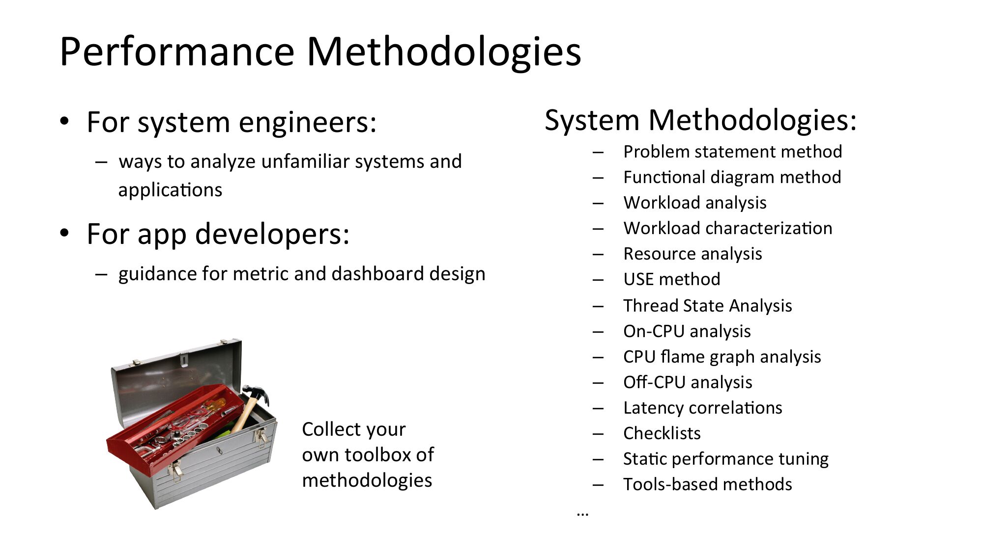 There's a new way to approach performance analysis that can guide you through the metrics. Instead of starting with traditional metrics and figuring out their use, you start with the questions you want answered then look for metrics to answer them. Methodologies can provide these questions, as well as a starting point for analysis and guidance for locating the root cause. They also pose questions that the existing metrics may not yet answer, which may be critical in solving the toughest problems. System methodologies include the USE method, workload characterization, drill-down analysis, off-CPU analysis, chain graphs, and more.