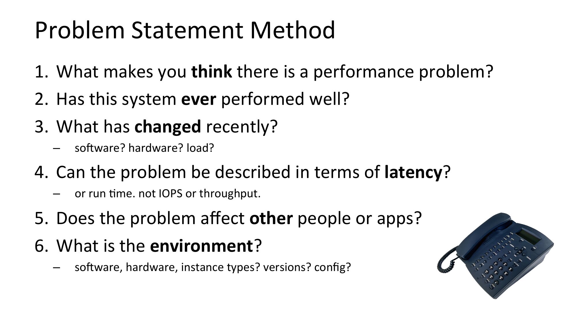 Problem Statement Method 1. What makes you think there is a performance problem? 2. Has this system ever performed well? 3. What has changed recently? soRware? hardware? load? 4. Can the problem be described in terms of latency? or run Nme. not IOPS or throughput. 5. Does the problem affect other people or apps? 6. What is the environment? soRware, hardware, instance types? versions? config?slide 17: