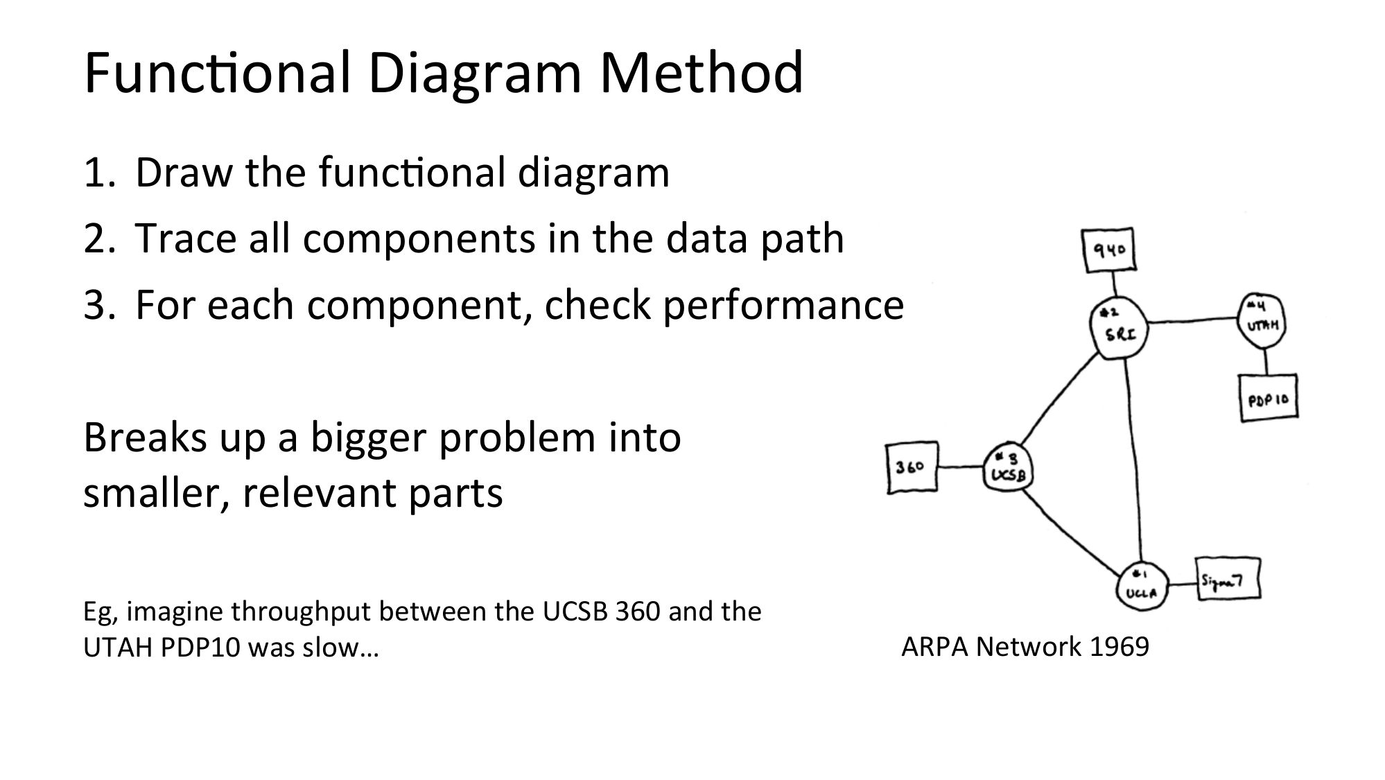 FuncNonal Diagram Method 1. Draw the funcNonal diagram 2. Trace all components in the data path 3. For each component, check performance Breaks up a bigger problem into smaller, relevant parts Eg, imagine throughput between the UCSB 360 and the UTAH PDP10 was slow… ARPA Network 1969slide 18: