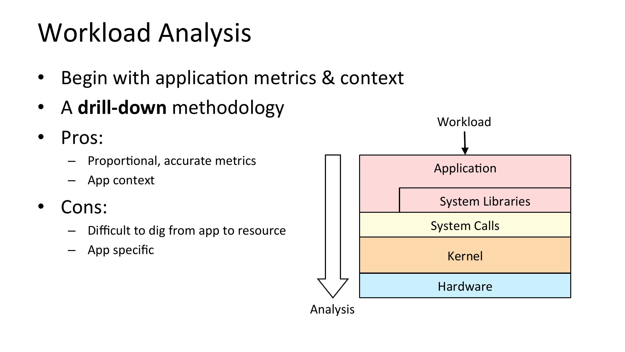 Workload Analysis • Begin with applicaNon metrics & context • A drill-down methodology • Pros: – ProporNonal, accurate metrics – App context Workload ApplicaNon System Libraries • Cons: System Calls – Difficult to dig from app to resource – App specific Kernel Hardware Analysisslide 19: